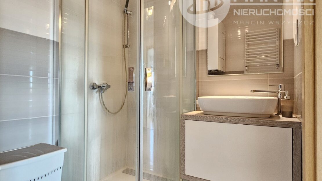 Łazienka – z kabiną prysznicową, umywalką, pralką, szafką, lustrem i WC.