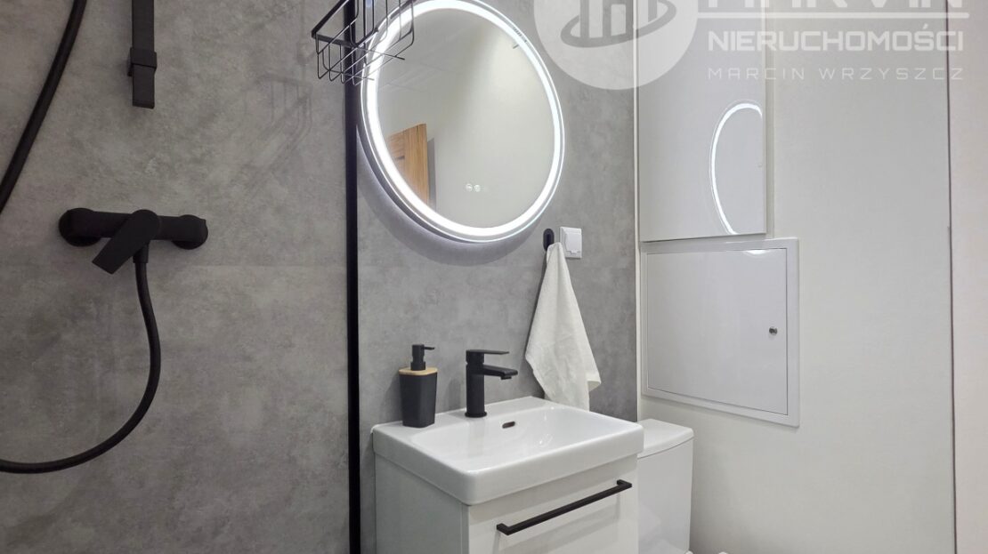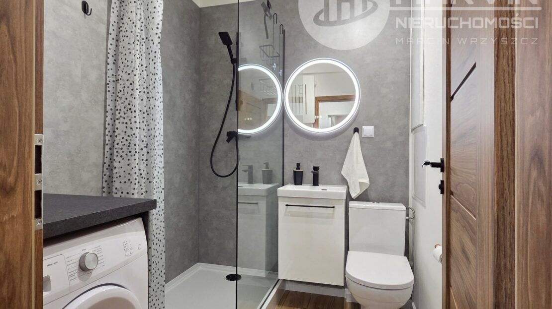 Łazienka – kabina prysznicowa, umywalka z przestronnym lustrem, toaleta, zabudowa oraz pralka