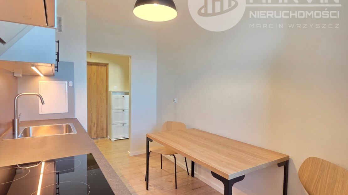 Kuchnia – duża lodówka z zamrażarką, piekarnik, mikrofalówka, płyta indukcyjna, zmywarka, pojemna zabudowa kuchenna, stół z dwoma krzesłami, wyposażenie kuchenne (małe AGD, komplet talerzy, sztućców, kubków itd)