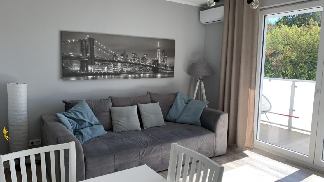Mieszkanie składa się z jasnego pokoju dziennego (salon), aneksu kuchennego, sypialni, łazienki i balkonu. Wszystkie pomieszczenia są świeżo po remoncie. Całość klimatyzowana jest indywidualną jednostką.