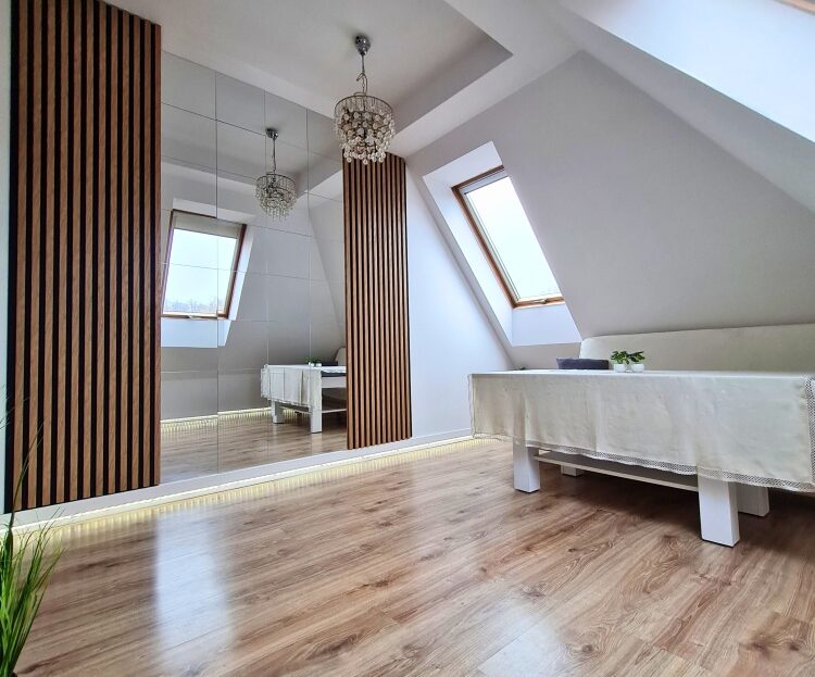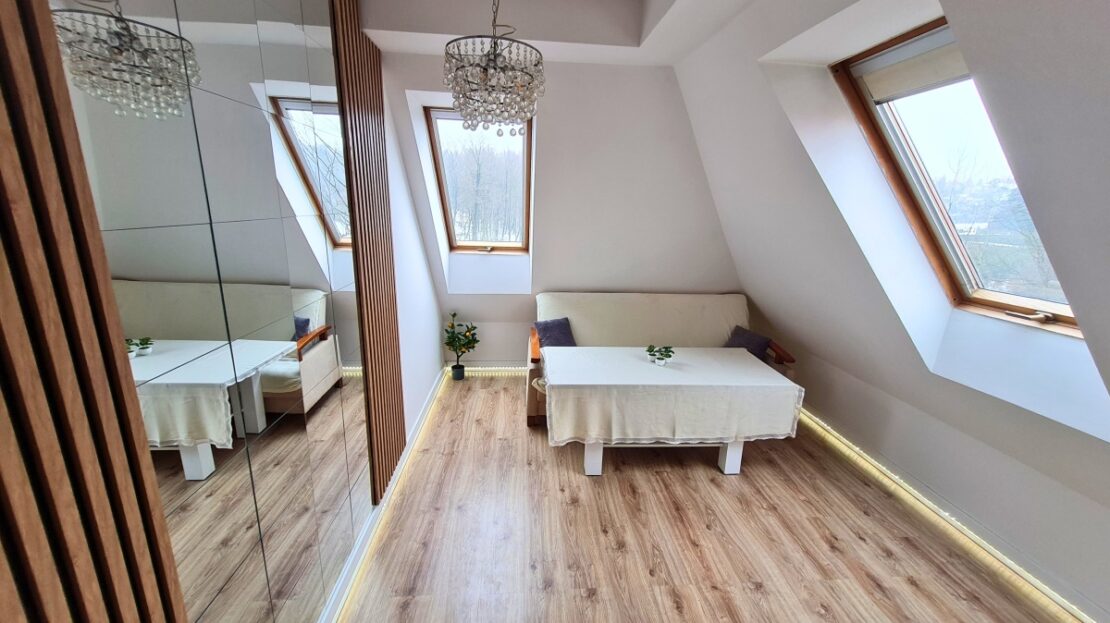 1 pokój: 11,80m (na zdjęciach z lamelami i lustrami) – dobrze doświetlony, użytkowany w formie salonu lub pokoju do pracy. Otwarte przejście do kuchni.