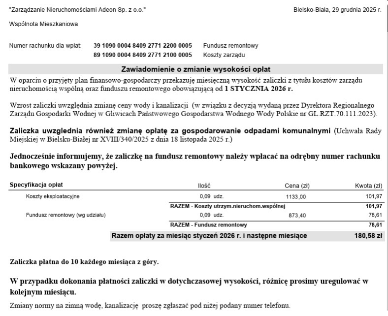 Bardzo niskie koszty utrzymania: 180 koszty stałe (w tym prąd na klatce schodowej, sprzątanie klatki, fundusz remontowy, opłaty administracyjne), do tego należy doliczyć – woda wg zużycia + śmieci.