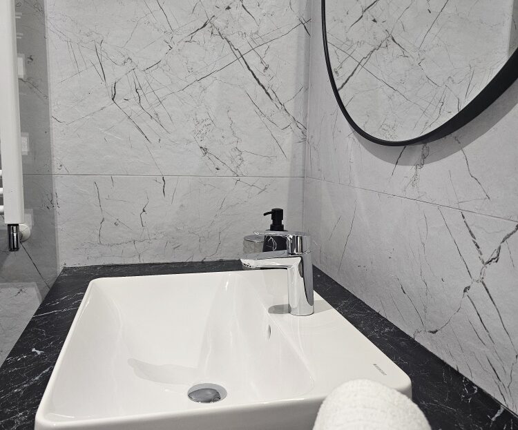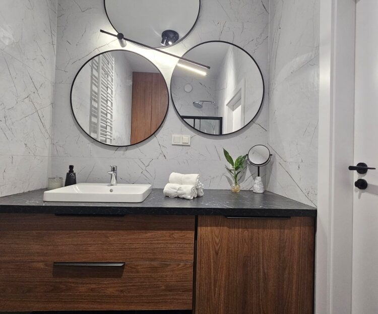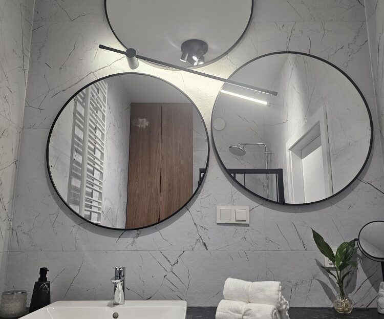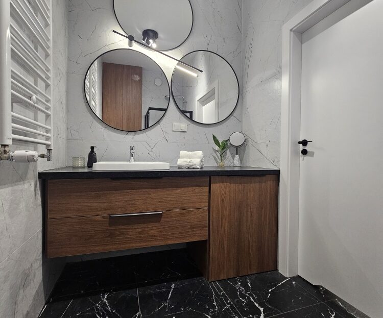 W łazience zabudowy na wymiar – geberitu oraz umywalki z pralką Whirpool – dają dużo miejsca do przechowywania, a trzy duże lustra o średnicy 80 cm każde potęgują wrażenie przestrzeni.