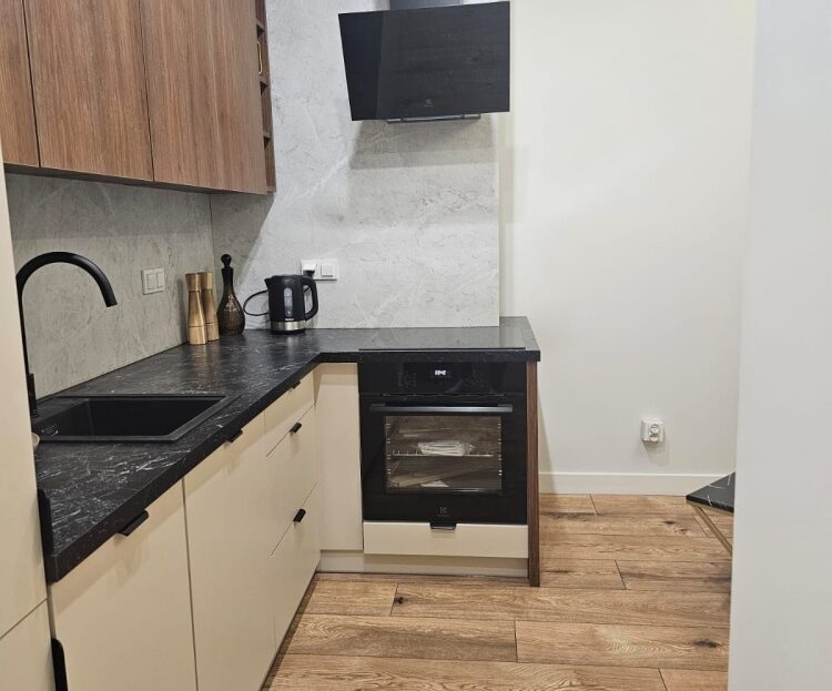 Mieszkanie obejmuje pełną zabudowę meblową w kuchni, przedpokoju oraz w łazience oraz starannie dobrane elementy wyposażenia.W salonie znajdują się designerskie meble, m. in. Sofa marki Gautier o nowoczesnym wzornictwie, dopasowane do charakteru wnętrza.