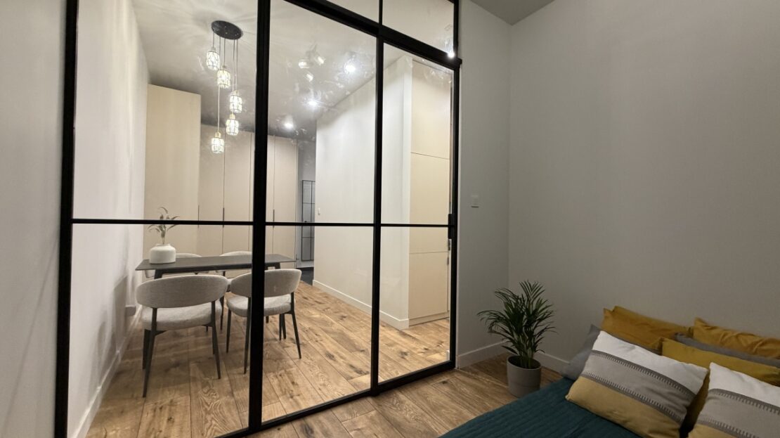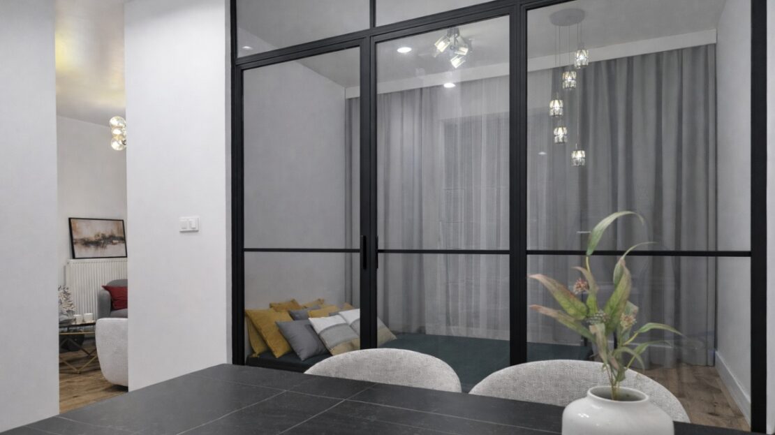 Ponadstandardowa wysokość pomieszczeń (3 metry) zapewnia poczucie przestrzeni i bardzo dobre doświetlenie wnętrza. Duże okna dodatkowo potęgują efekt przestronności i zapewniają dużo naturalnego światła przez cały dzień. Przeszklona ściana nadaje mieszkaniu nowoczesny, loftowy charakter.