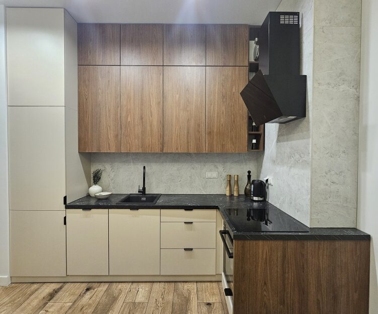 W całym mieszkaniu zastosowano spójną, naturalną kolorystykę premium w odcieniach ciepłego drewna, beżu i grafitu, tworząc harmonijne i ponadczasowe wnętrze.