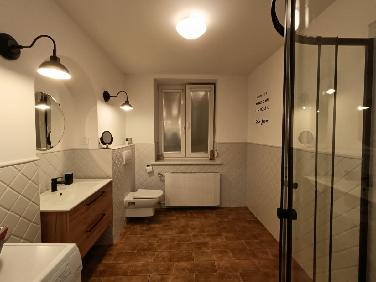 *Widna łazienka utrzymana w jasnych kolorach – prysznic, pralka.