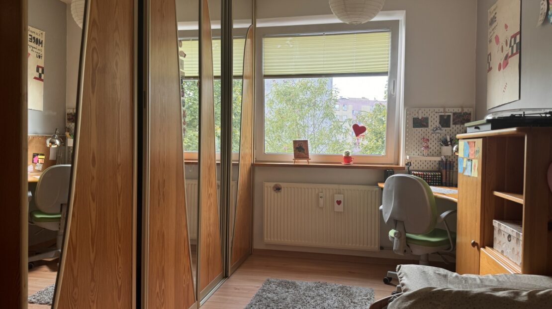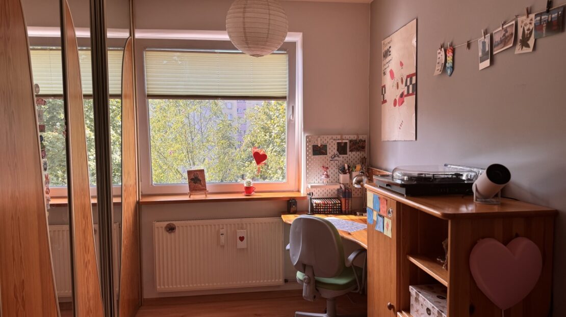 Lokal znajduje się na 3. piętrze, co zapewnia ciszę, poczucie prywatności oraz naturalne światło. Przemyślany układ mieszkania uzupełnia przestronny przedpokój z dużą, praktyczną szafą, oferujący wiele miejsca do przechowywania. Wnętrze utrzymane jest w jasnej kolorystyce. Sercem mieszkania jest salon z wyjściem na duży, słoneczny balkon. Okna oraz wyjście na balkon zapewniają doskonałe doświetlenie, a widok rozciąga się na otwartą przestrzeń – w najbliższym otoczeniu nie ma zabudowy. Ta perspektywa sprawia, że balkon stanowi idealne miejsce relaksu. Dwie pozostałe sypialnie są proporcjonalne i ustawne, co ułatwia aranżację zgodnie z potrzebami domowników – mogą pełnić funkcję pokoi dziecięcych, sypialni głównej lub domowego biura. Mieszkanie posiada widną, oddzielną kuchnię, w pełni zabudowaną i wyposażoną w sprzęt AGD, który pozostaje w cenie. Całość dopełnia przestronna łazienka oraz osobne WC, co stanowi rzadki atut i znaczne udogodnienie dla rodziny. Do mieszkania przynależy również duża piwnica stanowiąca dodatkowe miejsce do przechowywania oraz wózkownia dla mieszkańców.