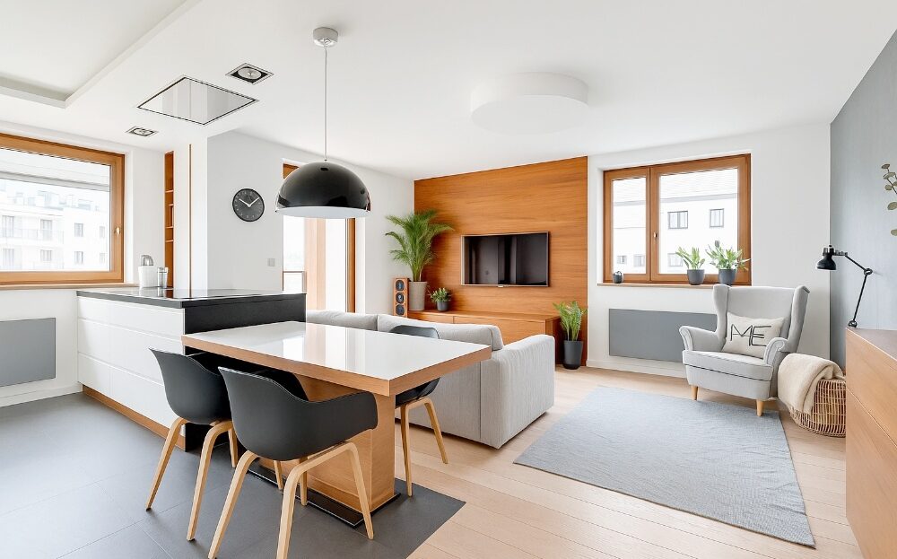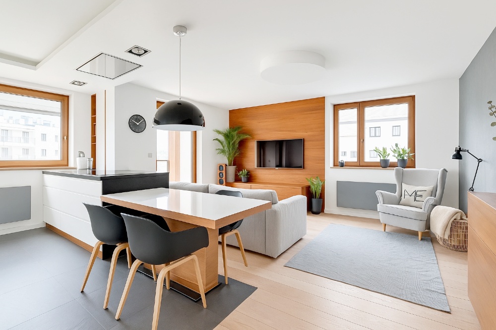 • Salon z aneksem kuchennym – 34,8 m² + wyjście na przestronny taras – 16,2 m2