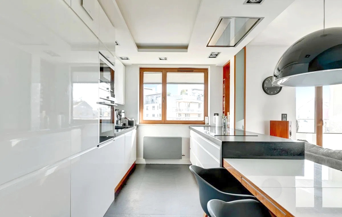 W kuchni bardzo solidna zabudowa stolarska na wymiar, nowe fronty w stanie idealnym, dużo szuflad w systemie Blum, wysokie i niskie carga od Peka. Nowoczesny okap w suficie do zabudowy, designerski