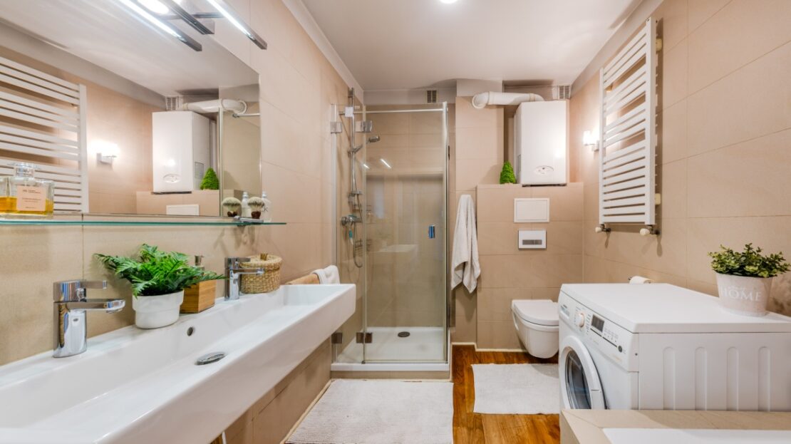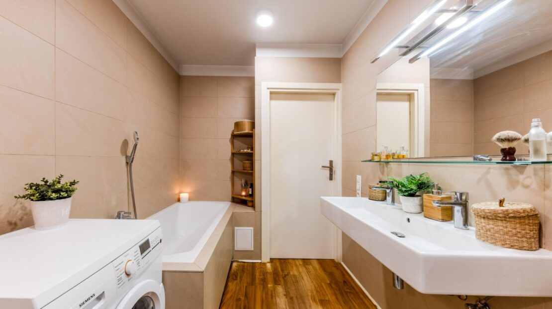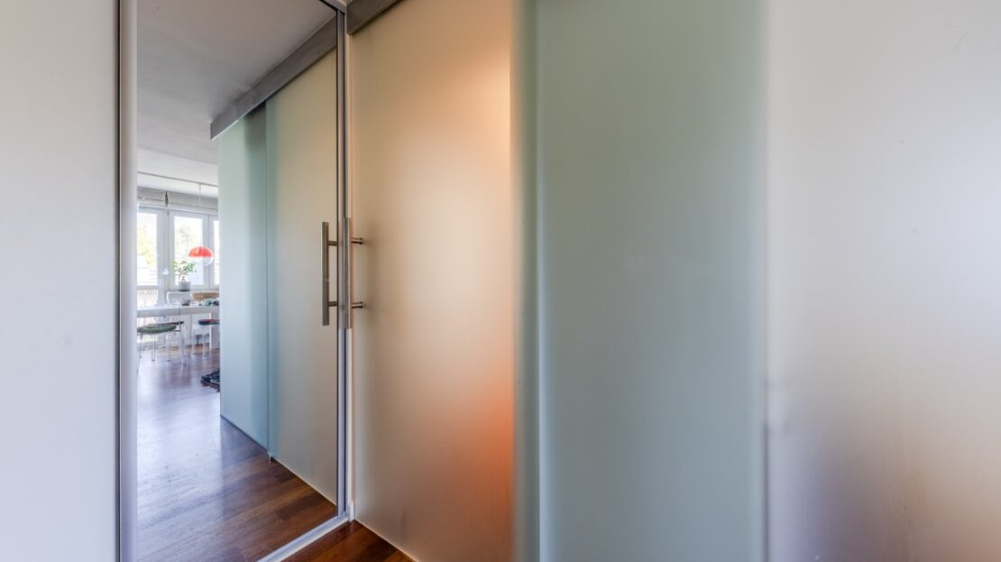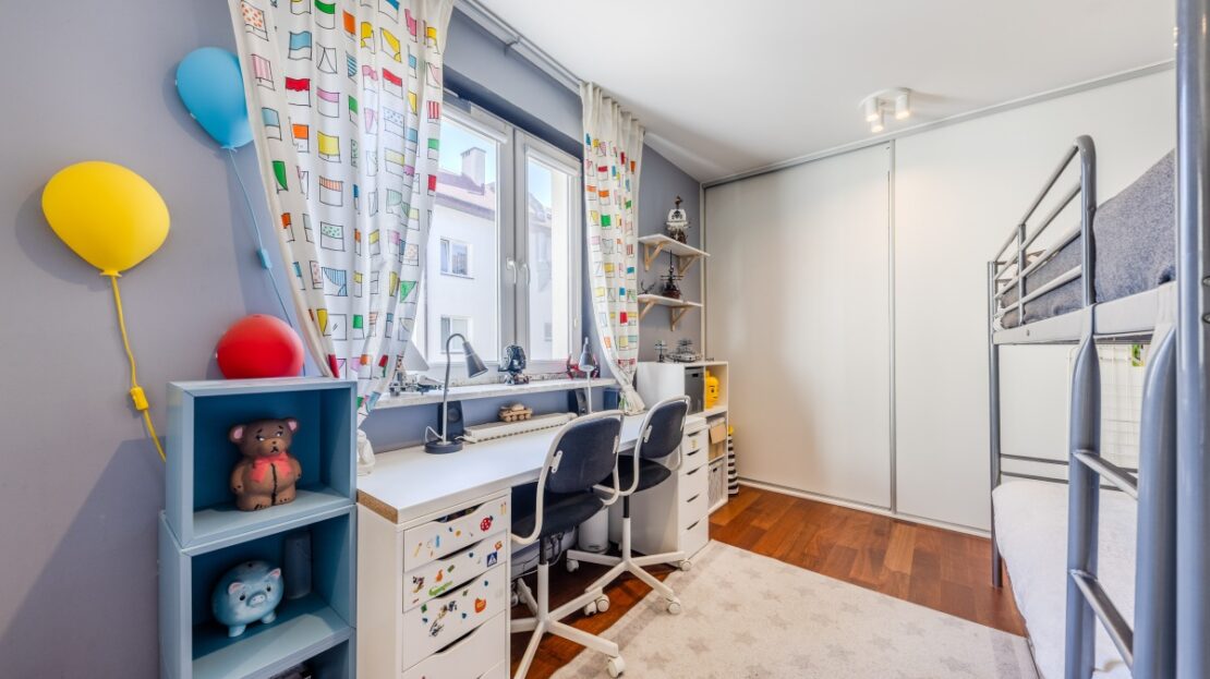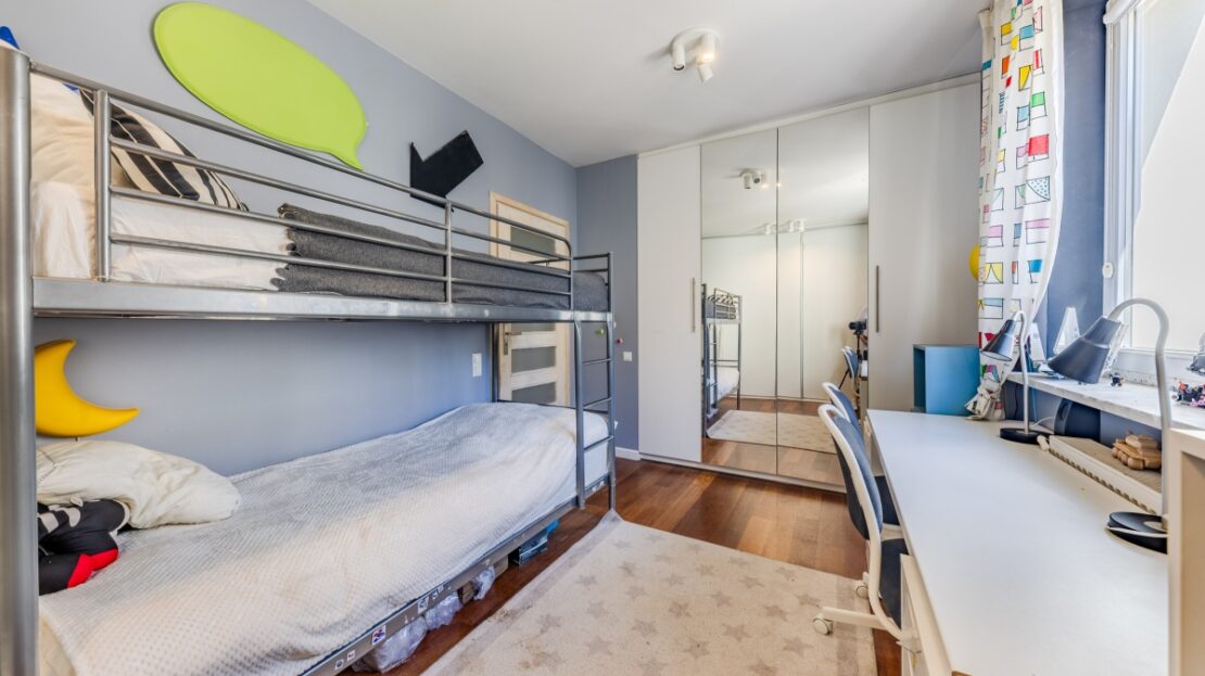 Strefa sypialniana została oddzielona eleganckimi, przesuwnymi drzwiami ze szkła, co pozwala zachować poczucie prywatności, nie tracąc lekkości przestrzeni. Dwie przestronne sypialnie wyposażone są w zabudowane oraz wolnostojące szafy. Łazienka stanowi idealne dopełnienie tej komfortowej przestrzeni – mieści zarówno wannę, jak i prysznic oraz podwójną umywalkę, co czyni ją wygodną dla całej rodziny.