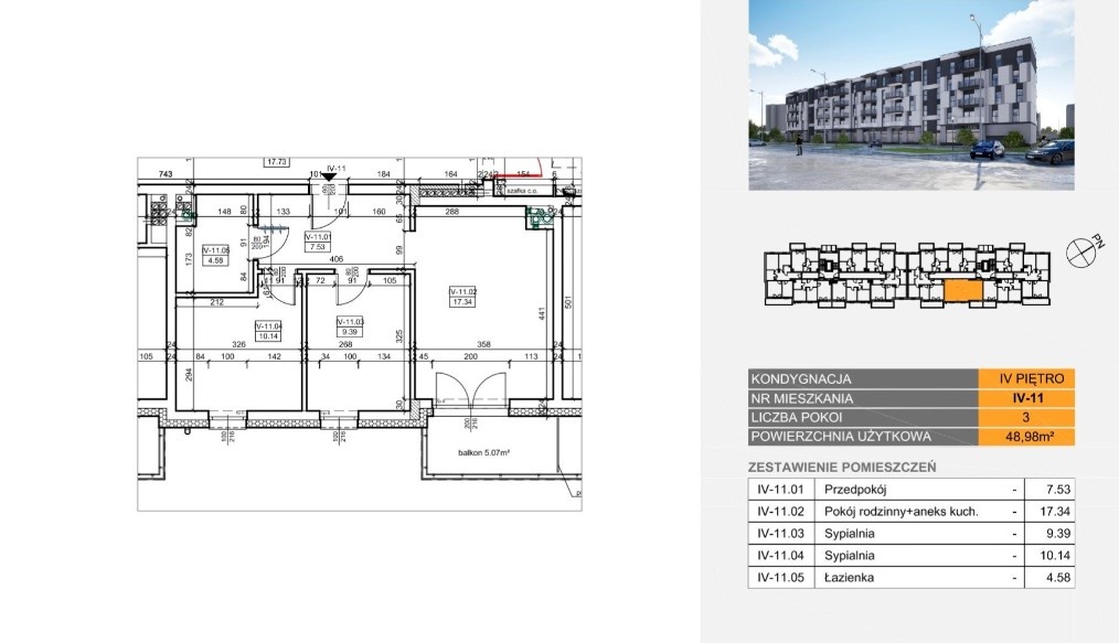 Powierzchnia mieszkania 48,98 m2, na którą składają się: