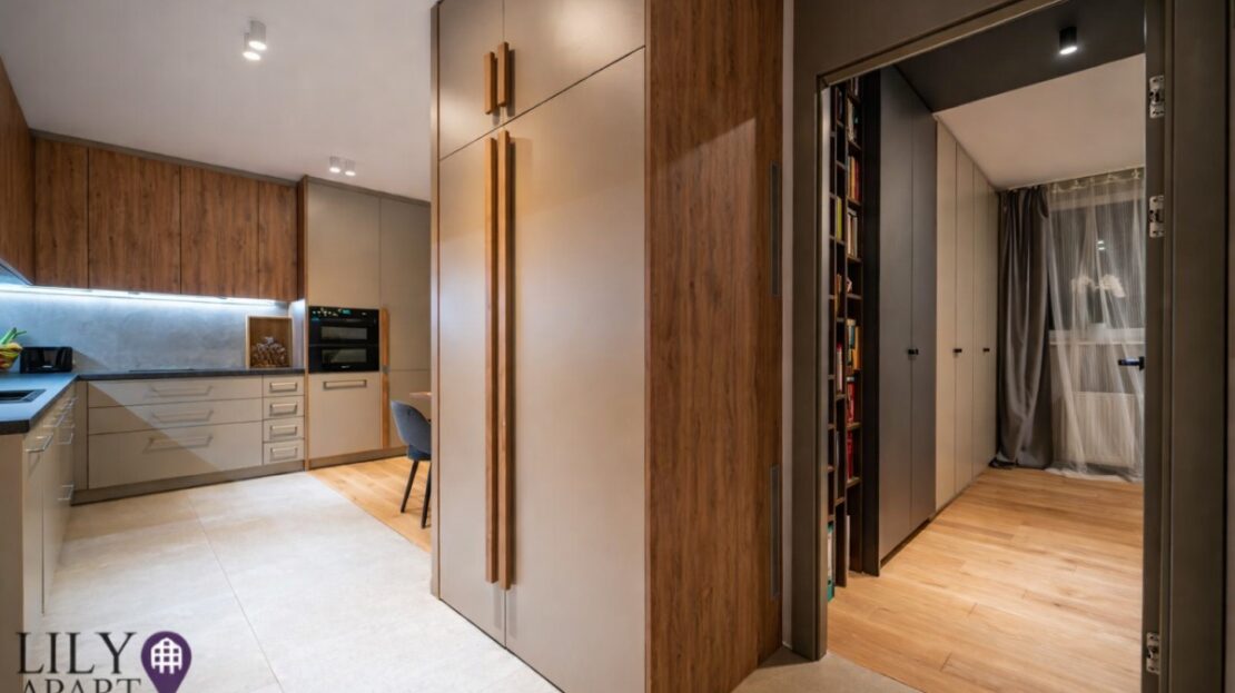 W korytarzu, tuż przy wejściu do mieszkania, znajdują się dwie bardzo pojemne szafy. Jedna przeznaczona typowo na obuwie, druga na kurtki, płaszcze i inną odzież wierzchnią. Bliżej kuchni, do dyspozycji lokatorów jest kolejna, robocza szafa, w której znajdują się pralka (Samsung) oraz suszarka (Samsung). W drugiej części szafy półki, umożliwiające przechowywanie środków czystości, środków do prania itp.