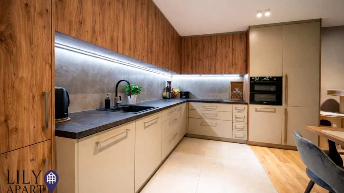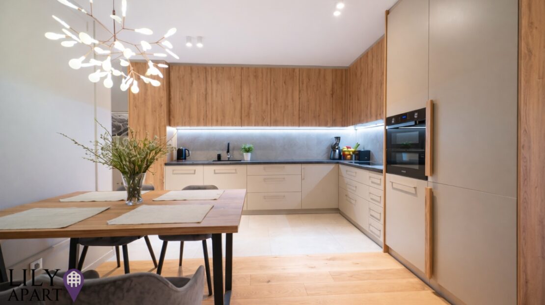 To otwarta przestrzeń w pełni wyposażona we wszystkie urządzenia niezbędne do komfortowego mieszkania. Kuchnia jest połączona z częścią jadalną i dalej z salonem. Meble, które znajdują się w kuchni, zostały przygotowane przez stolarza. Bardzo duża ilość szafek i szuflad. Każda dostępna przestrzeń została wykorzystana do maksimum.