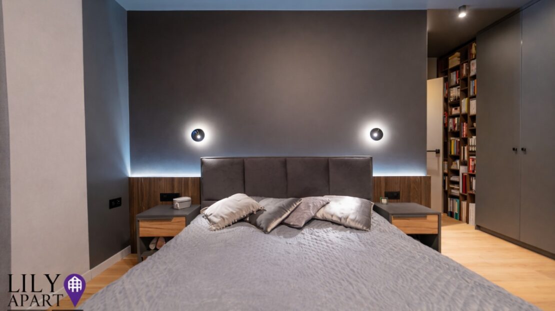 W sypialni znajduje się duże łóżko z materacem (160 x 200 cm), dwie szafki nocne z oświetleniem kierunkowym, łóżka toaletka z lustrem, pojemna, kilkuczęściowa szafa oraz biblioteczka.