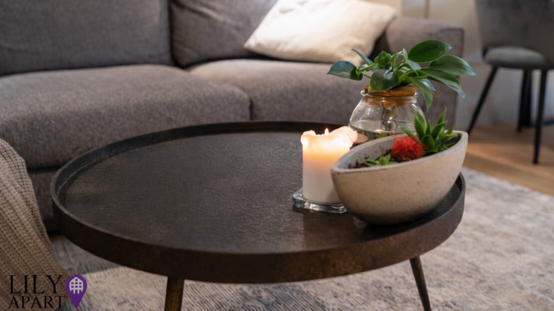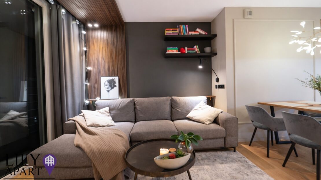 Sercem salonu jest narożna kanapa, z możliwością rozłożenia, co służyć może jako dodatkowa przestrzeń do relaksu lub miejsce do spania.