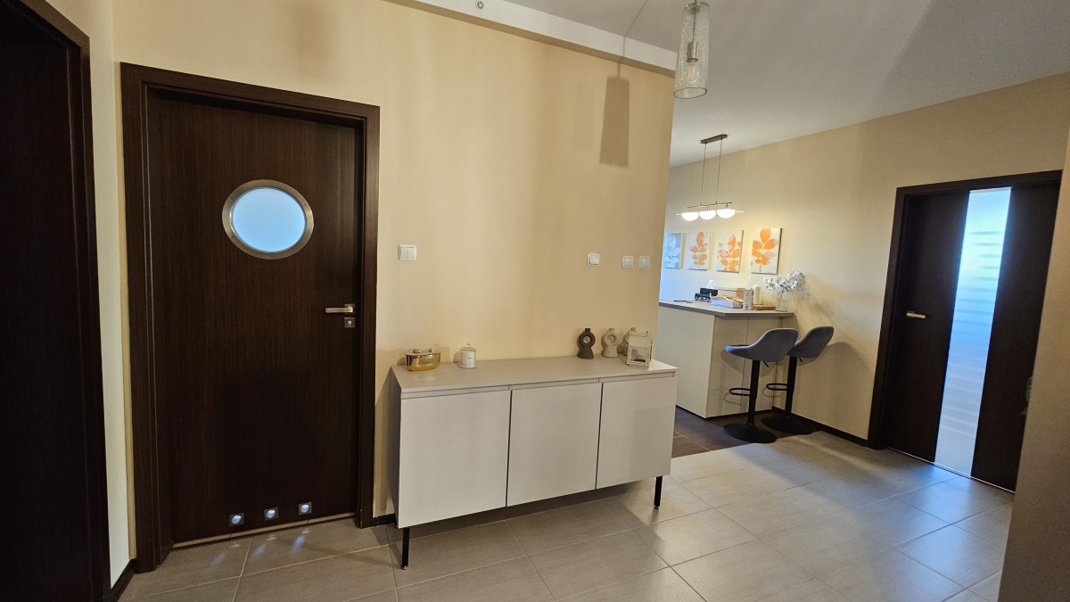 Przestronny salon o powierzchni 29,58 m² z wyjściem na balkon – to serce mieszkania, doskonałe miejsce do wypoczynku i spotkań z rodziną oraz przyjaciółmi