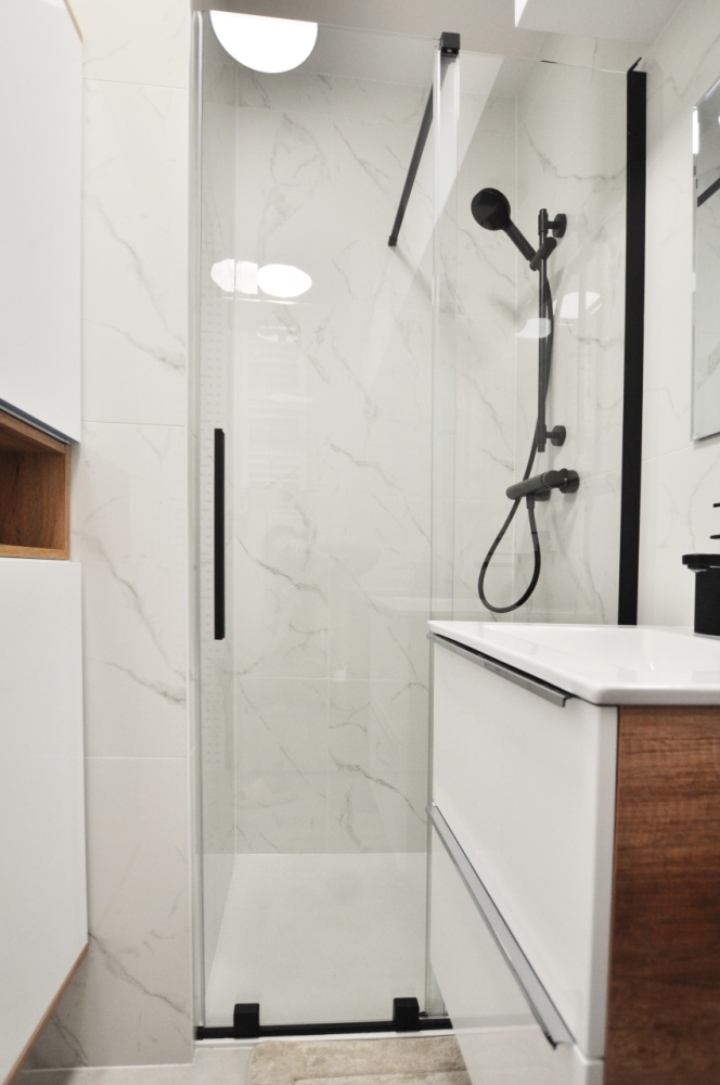 – łazienka w nowoczesnym wykończeniu: duża kabina prysznicowa, deszczownica, czarna armatura, zabudowa meblowa, pralka
