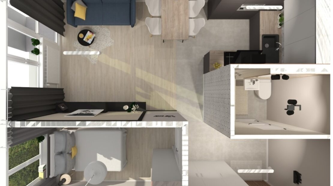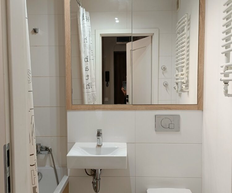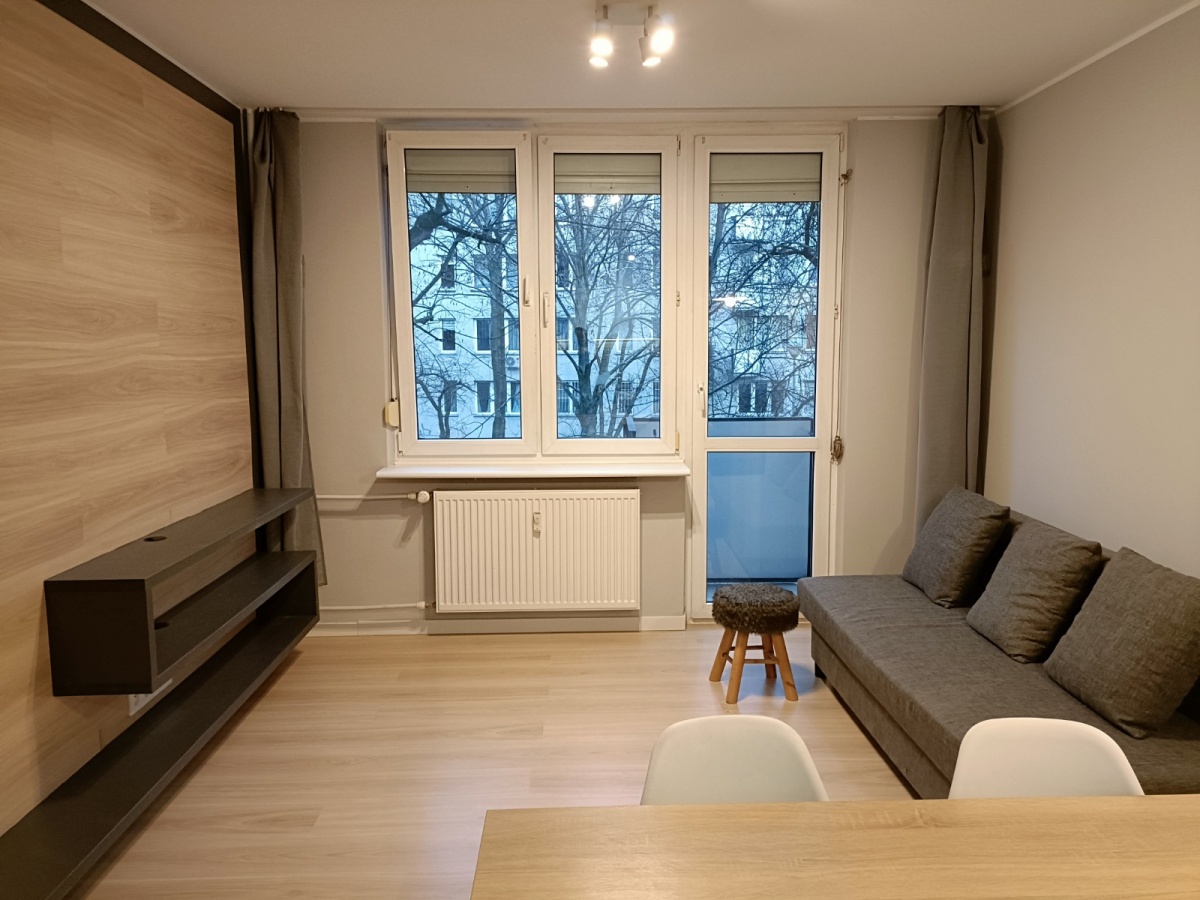 A modern, architect-designed 2-room apartment (38 m²) available for long-term rent. Located on Kondratowicza Street, right next to the Bródno Metro station. Special price until April!