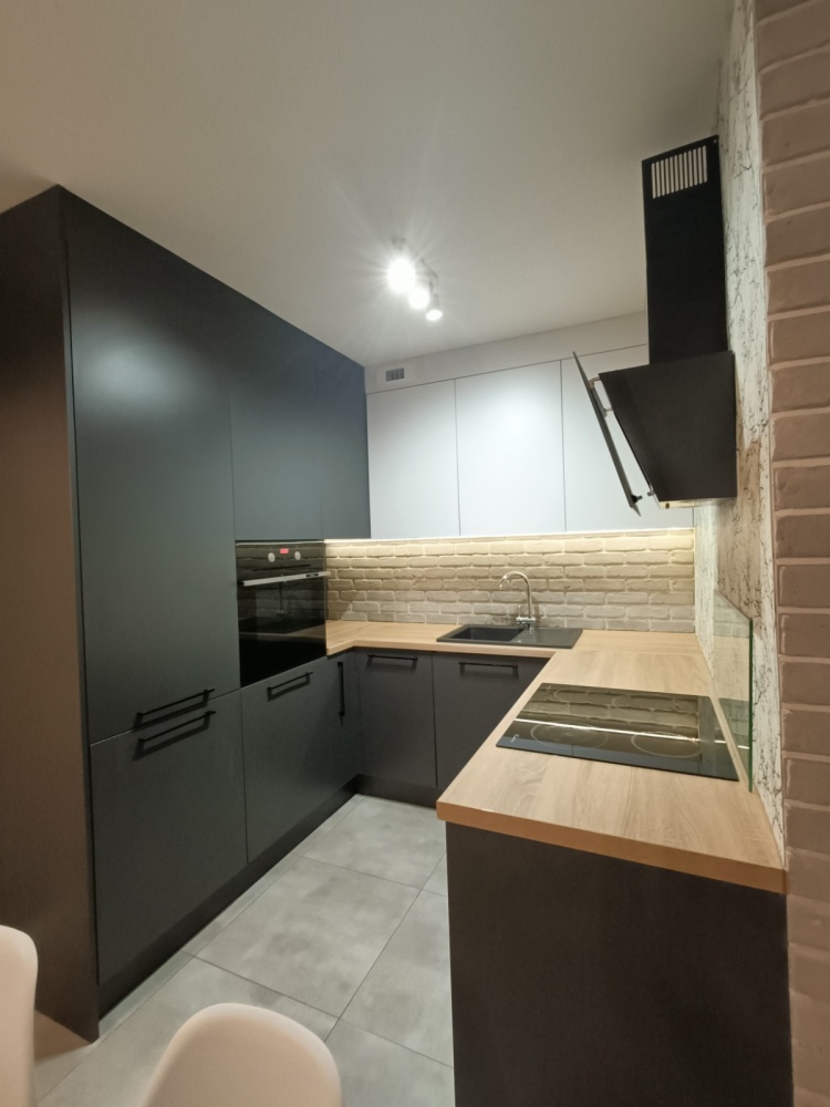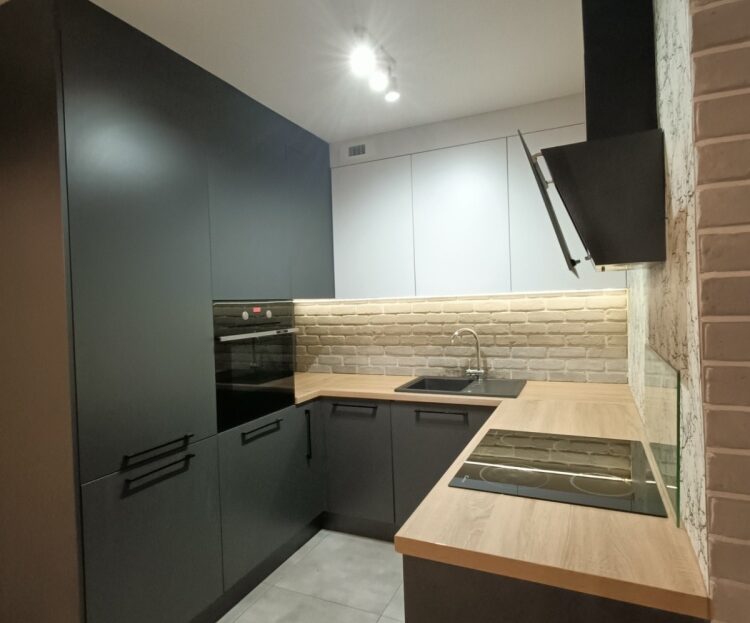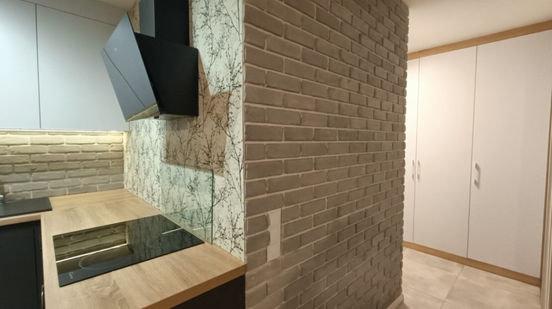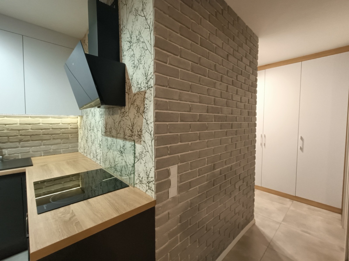Salon z kuchnią: Meble na wymiar, stylowa cegła na ścianie, nowa szafka RTV i pełne wyposażenie AGD.