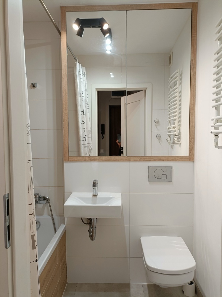 Łazienka: Elegancka, z wanną, dużym lustrem i nowoczesną zabudową.