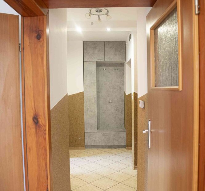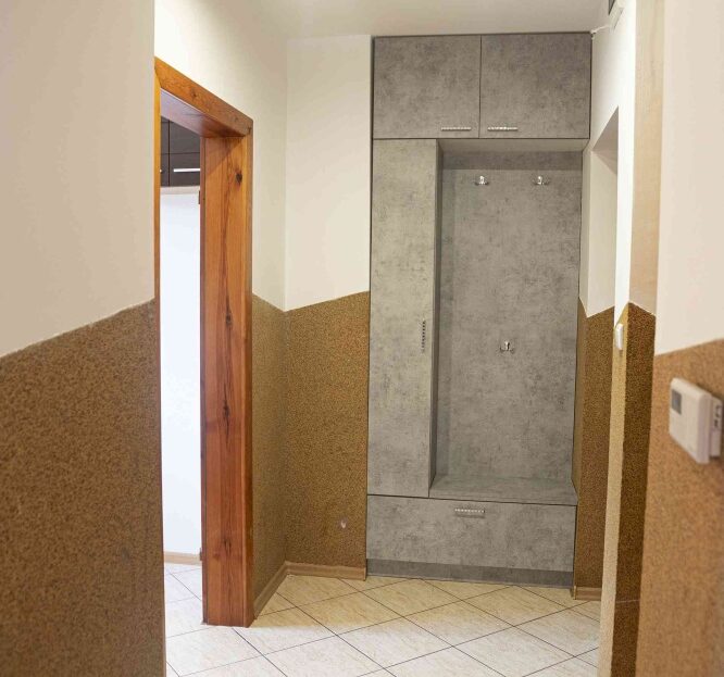 -przedpokój z szafą na ubrania i buty, doskonale komunikujący wszystkie pomieszczenia.