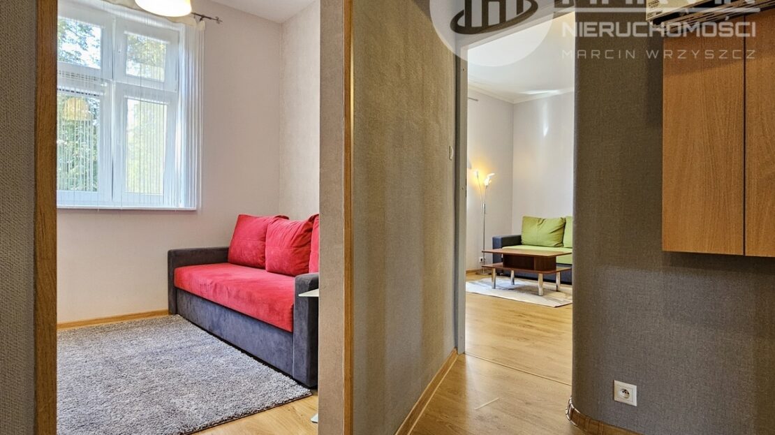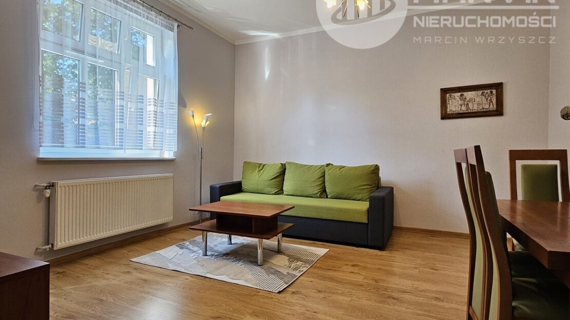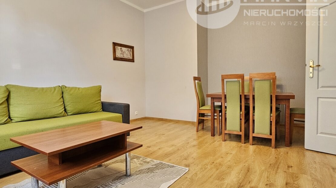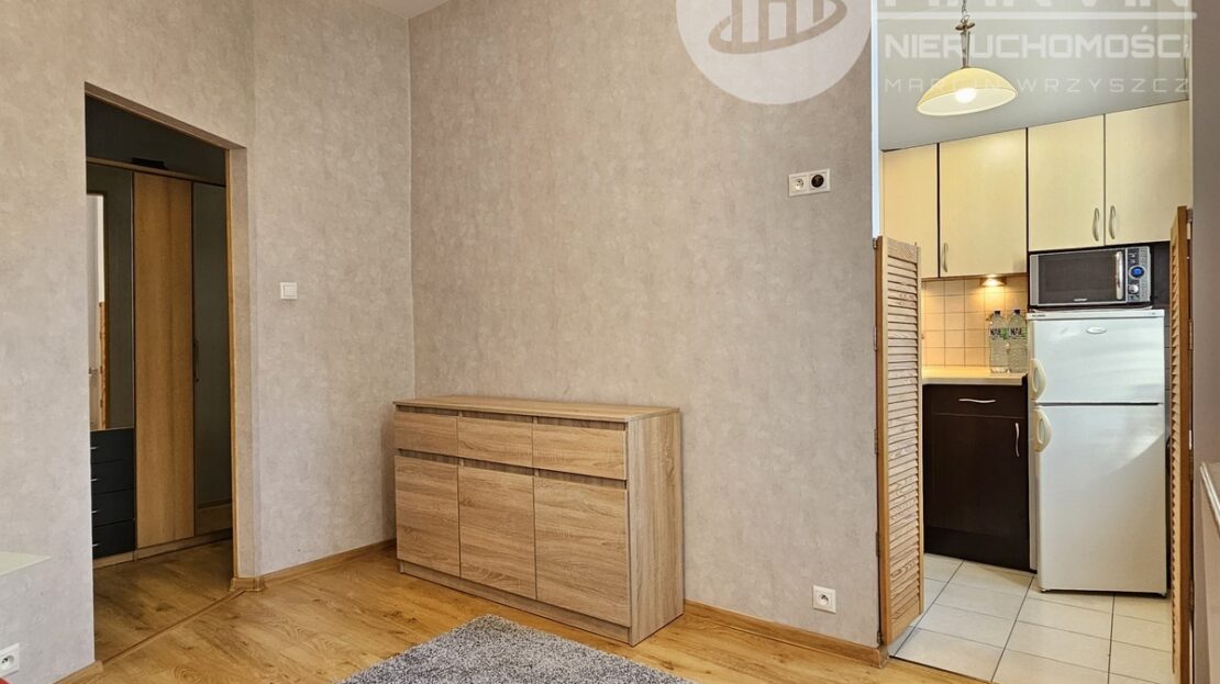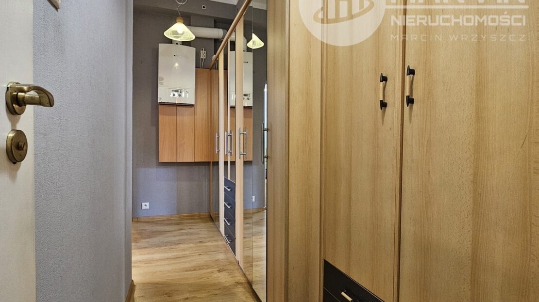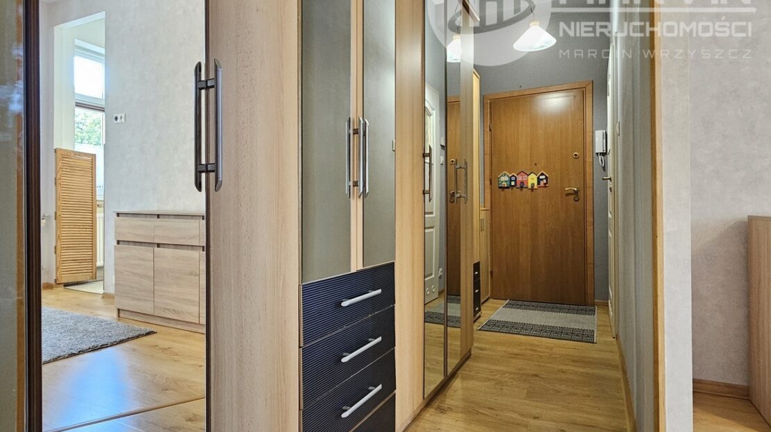 Na 44m2 składają się: umeblowany salon, pokój z wejściem do wyposażonej kuchni, wyposażona łazienka i korytarz z wieloma szafami.