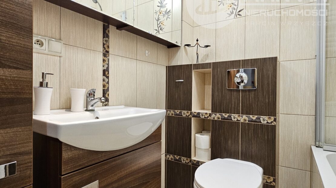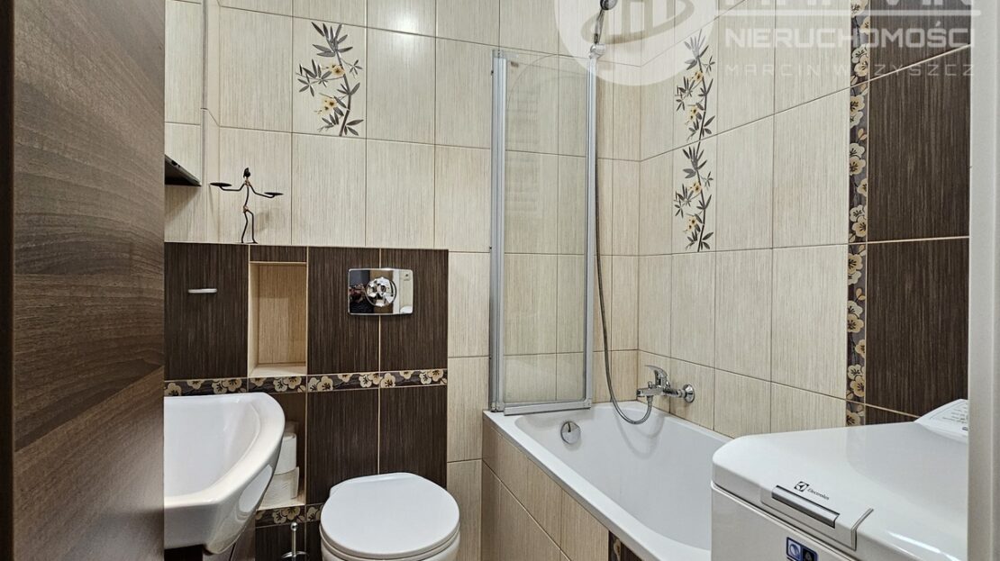 Łazienka – wanna z prysznicem, pralka, szafka z lustrem, zabudowa łazienkowa.