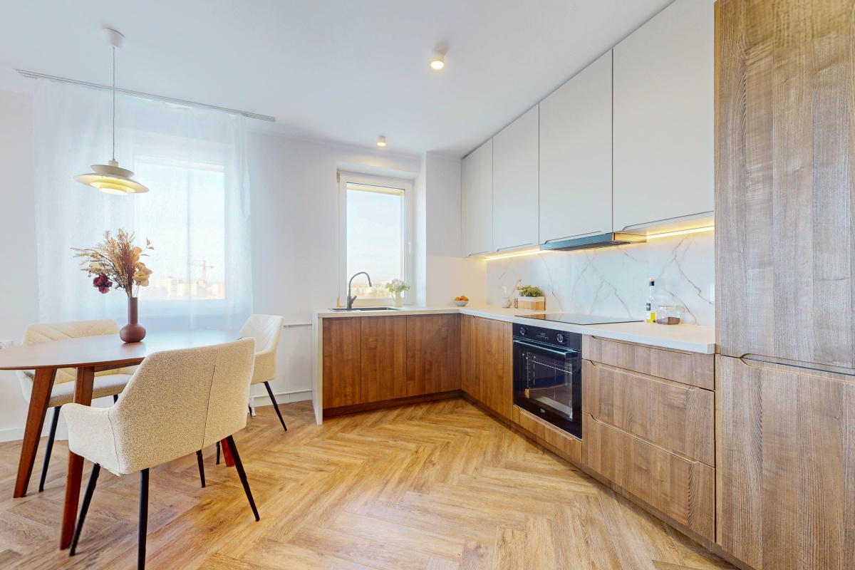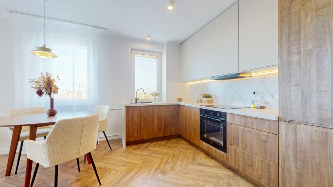 Mieszkanie w pełni wykończone i wyposażone. Gotowe do wprowadzenia, niezamieszkane. Cena obejmuje pełne wyposażenie, zabudowy meblowe wraz ze sprzętami agd na gwarancji (pralka, lodówka, zmywarka, płyta, piekarnik).