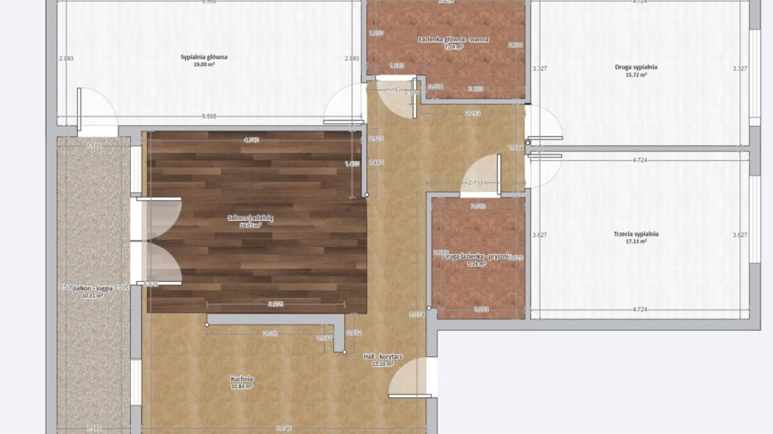 3 sypialnie, 2 łazienki, duży balkon typu loggia.