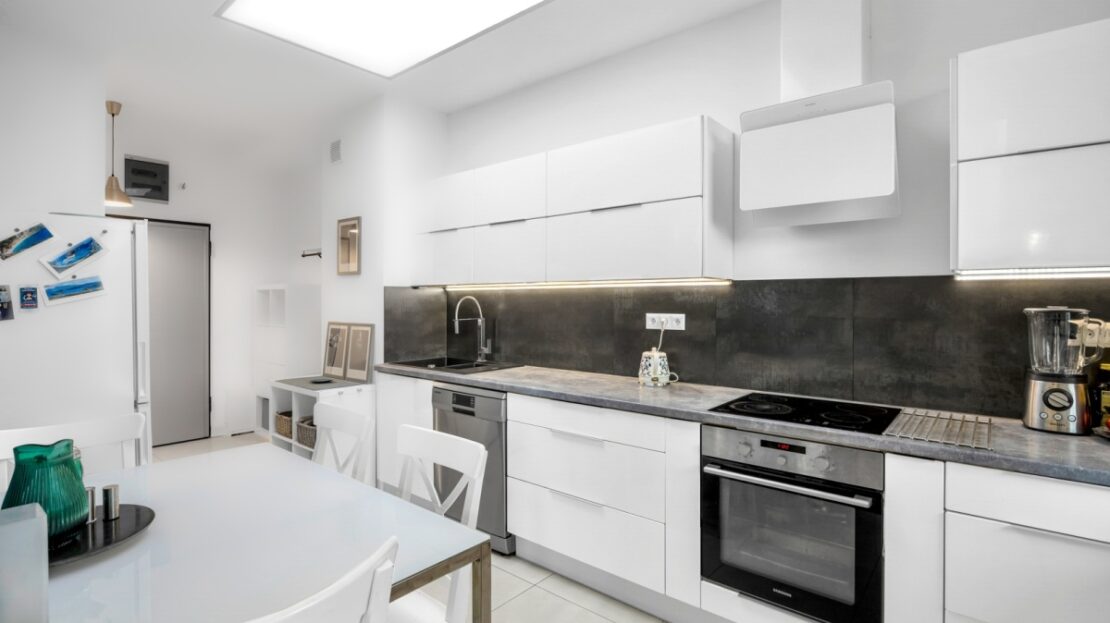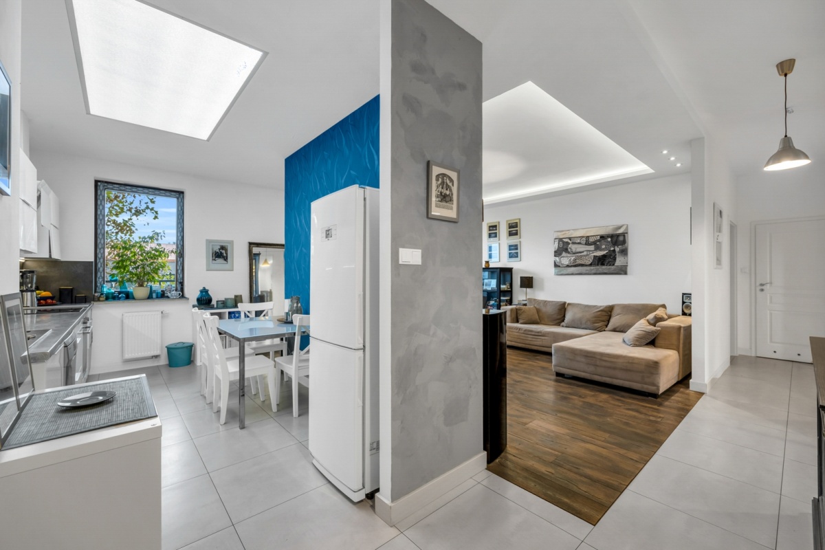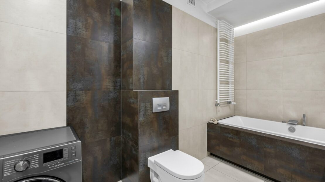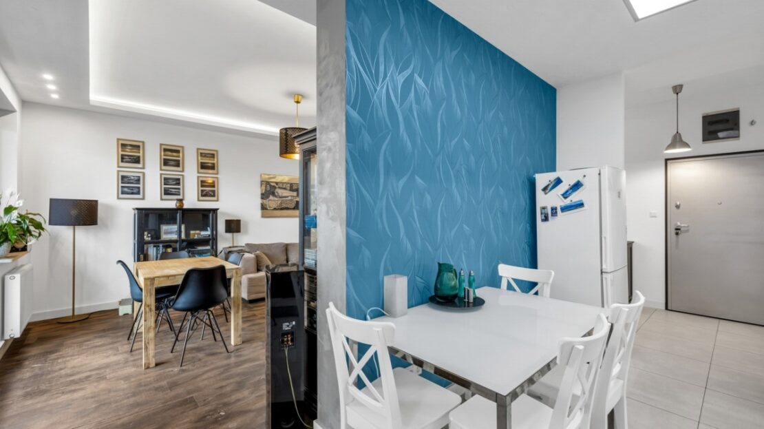 Projekt mieszkania został zoptymalizowany – powiększono łazienki i otwarto przestrzeń między kuchnią a salonem. Starannie zaprojektowana przestrzeń zapewnia dużą funkcjonalność i wygodę.