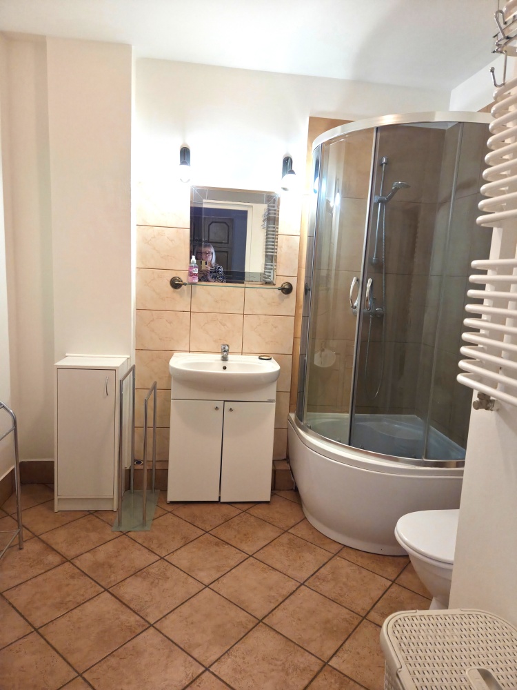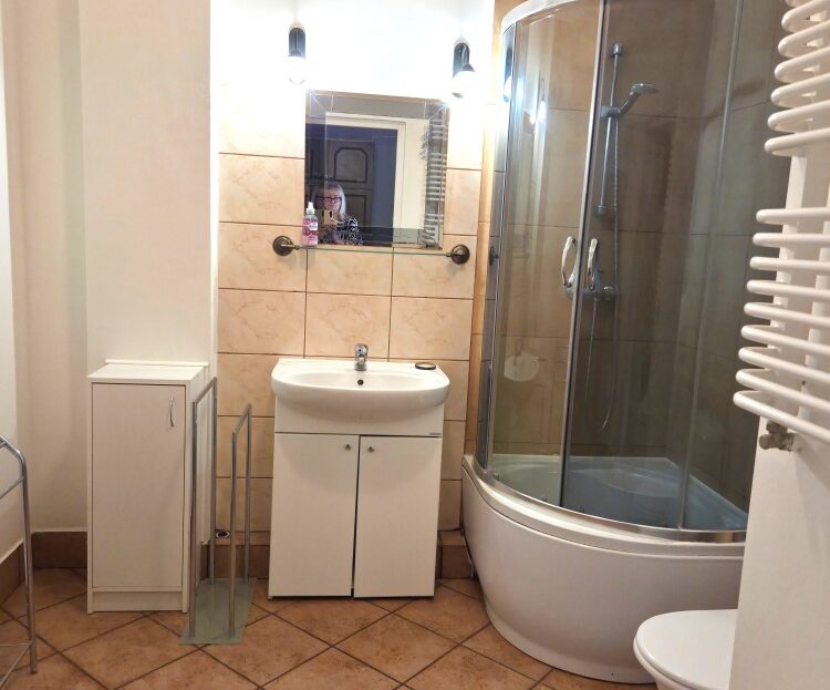 – W łazience pokrytej gresem znajduje się kabina prysznicowa, umywalka, wc. (możliwe przeniesienie wc do p/pokoju)