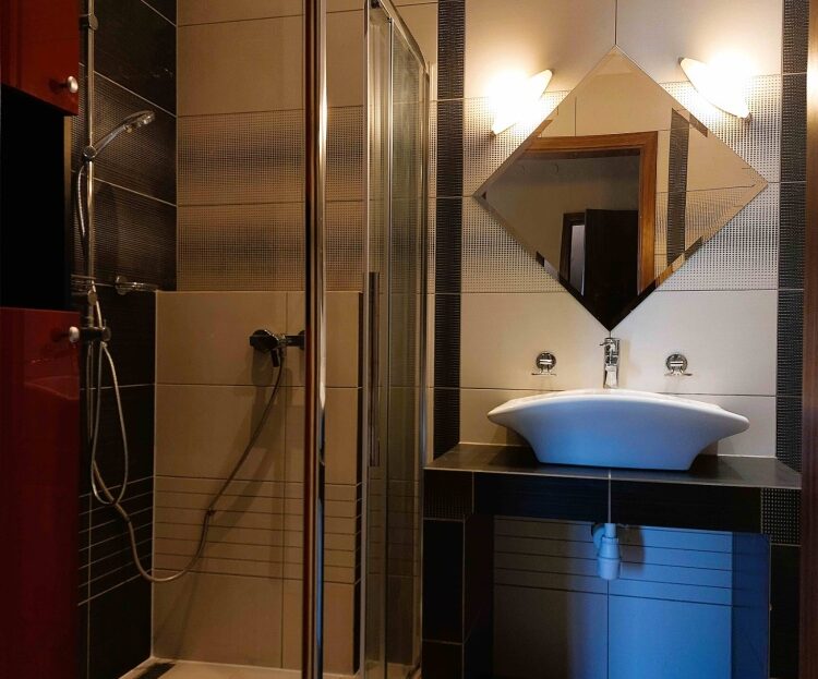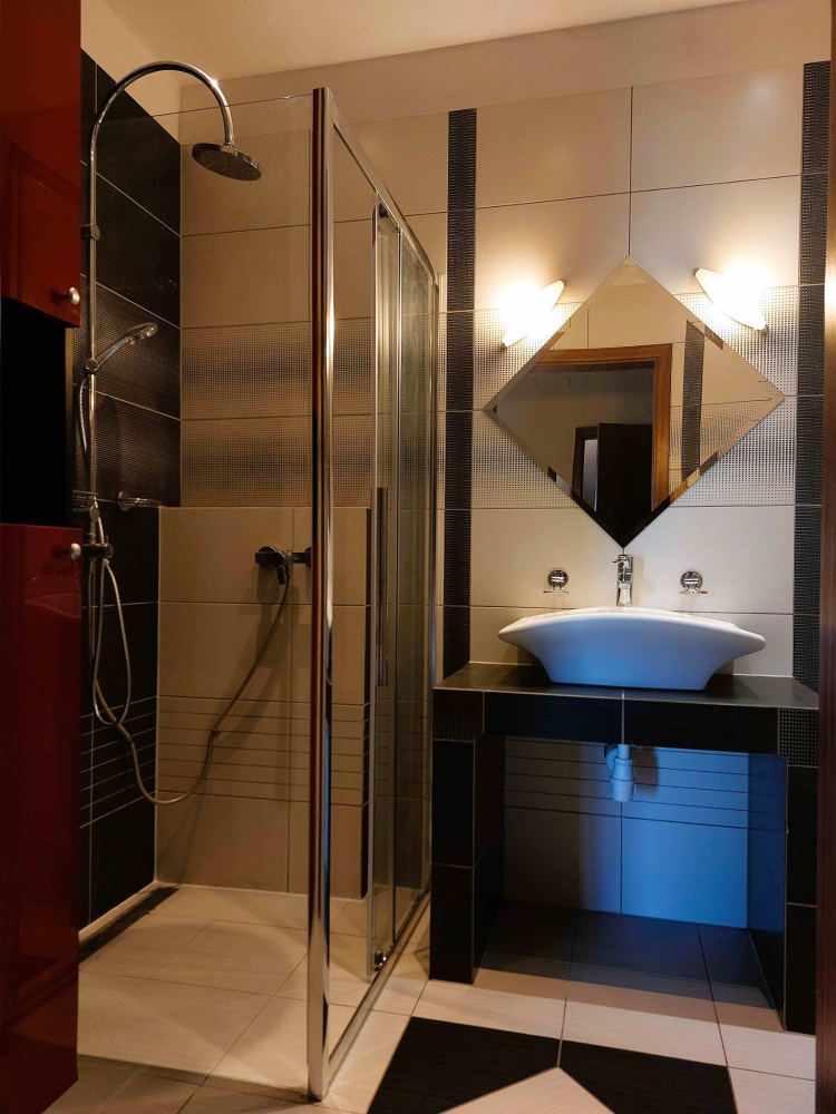 – łazienka z kabiną prysznicową typu walk-in, WC, umywalką i pralką (4,7 m2).