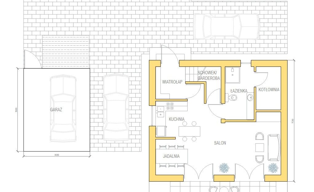 Garaż? Niby jest, 5m x 4m, ale nie wpisany w bryłę budynku. Twojemu autku nie będzie tak ciepło. No a drugie to w ogóle będzie musiało stać pod chmurką.