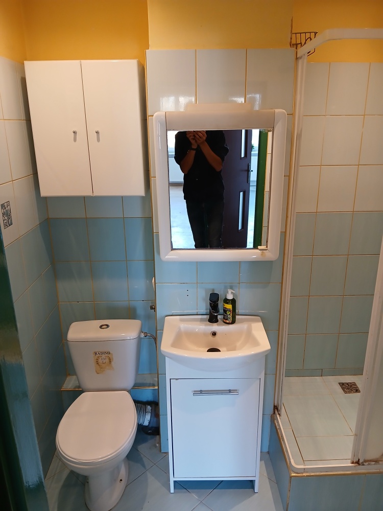 Łazienka z prysznicem i miejscem na pralkę lub opcją wstawienia wanny