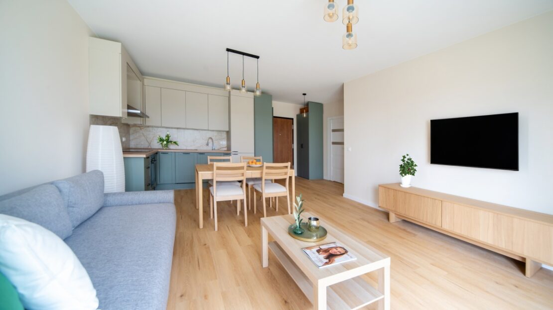 Nowe meble, w salonie kanapa z funkcją spania, aneks kuchenny w zabudowie kompletnie wyposażony .