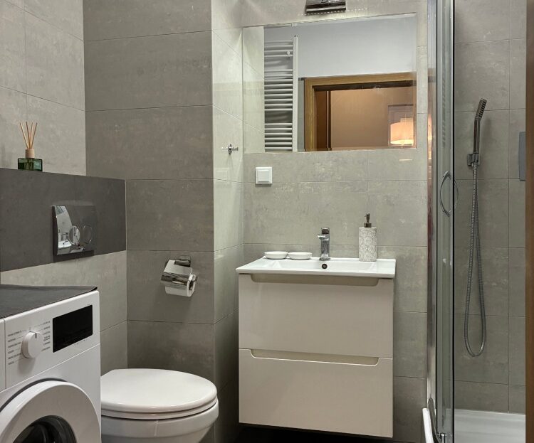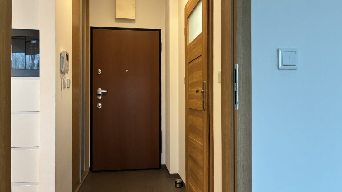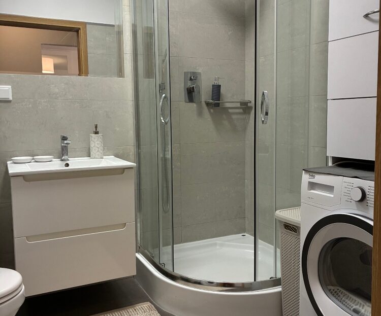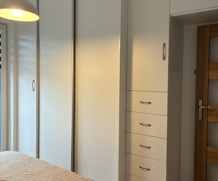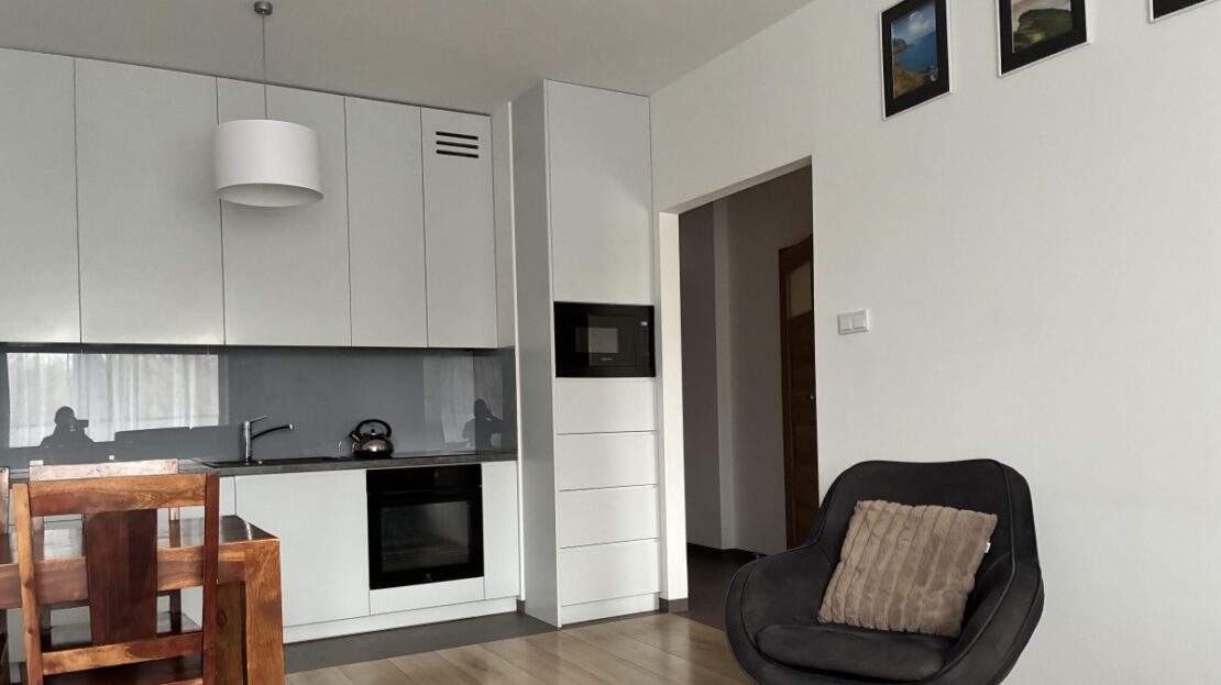– The apartment is fully furnished and was designed for the owner’s own use, with great attention to the quality of materials and functionality of the space. Custom-made furniture maximizes the usable area. New kitchen furniture, high-class household AGD, wooden furniture (table, chairs), additionally a sofa, armchair, chests of drawers, and TV. The bathroom features a new shower, washing machine, and automatic dryer. The bedroom has a custom-made wardrobe and a new double bed. The apartment is equipped with high-quality air conditioning in both the living room and the bedroom. A large terrace is accessible from both the living room and the bedroom.