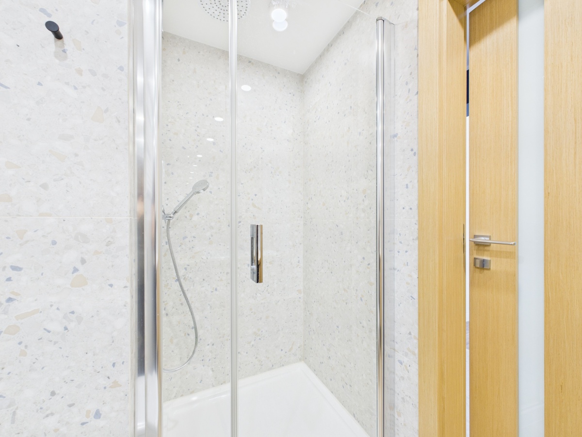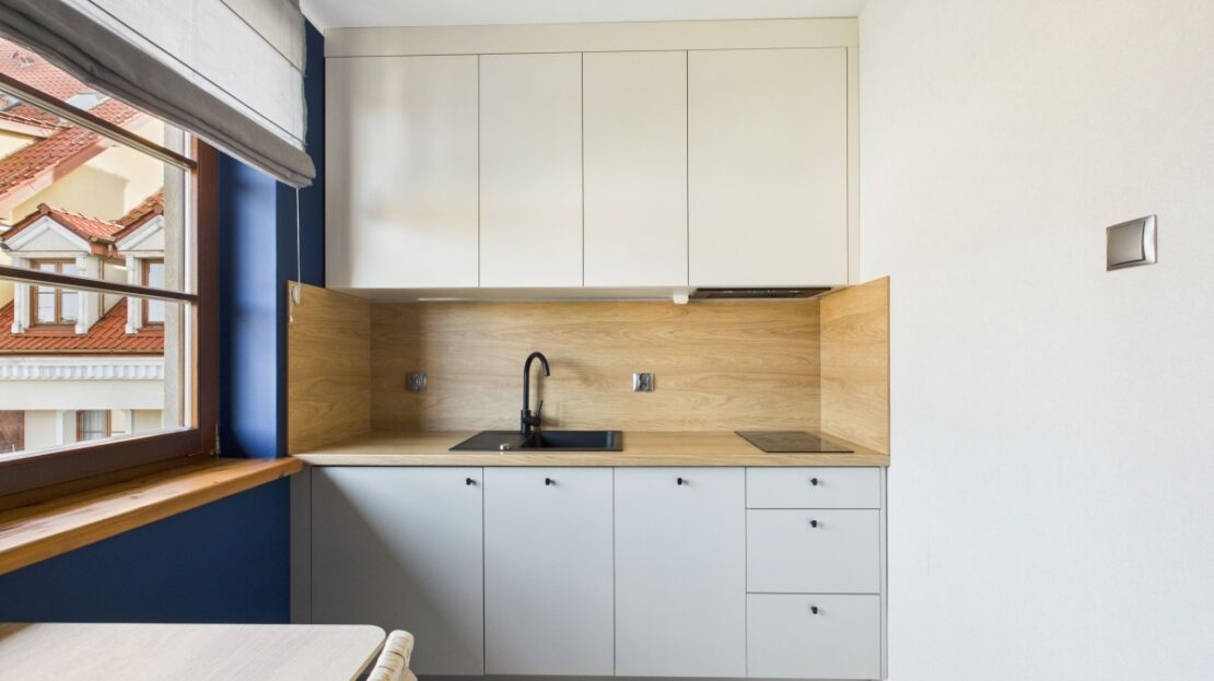 Powierzchnia mieszkania to 34,5 mkw – składa się z pokoju z balkonem francuskim, z osobnej kuchni, która jest w pełni wyposażona (lodówka, zmywarka, płyta, okap) oraz z łazienki z kabiną prysznicową.