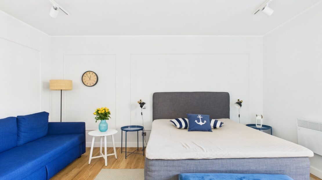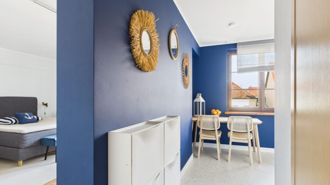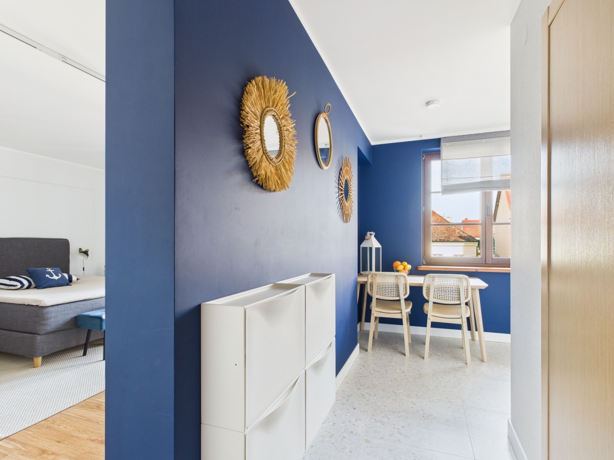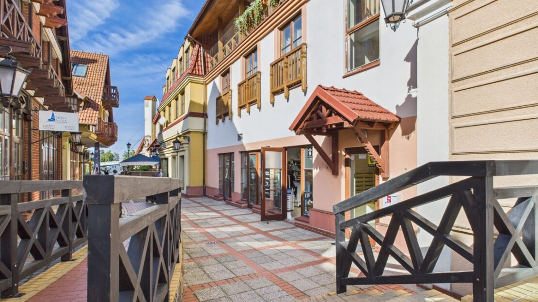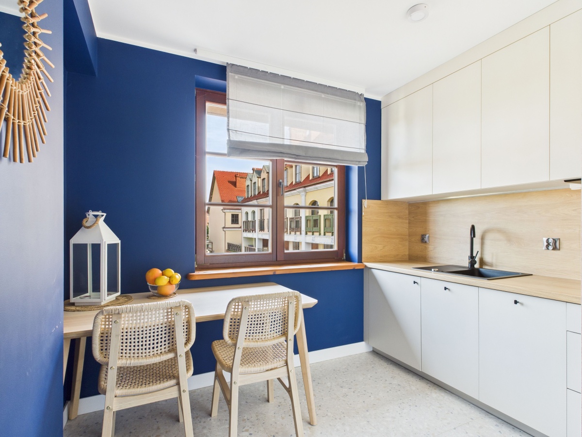 Mieszkanie ma świetną lokalizację – w niecałą minutę jesteśmy przy jeziorze Mikołajskim, Promenadzie i Porcie Mikołajki.