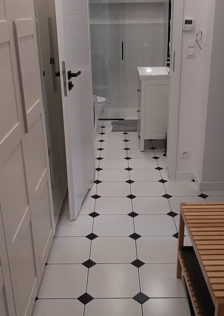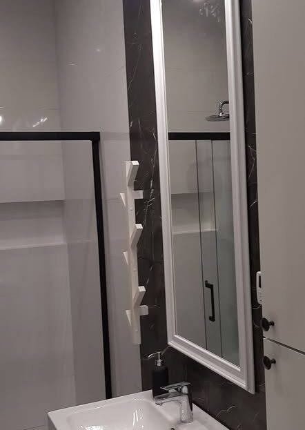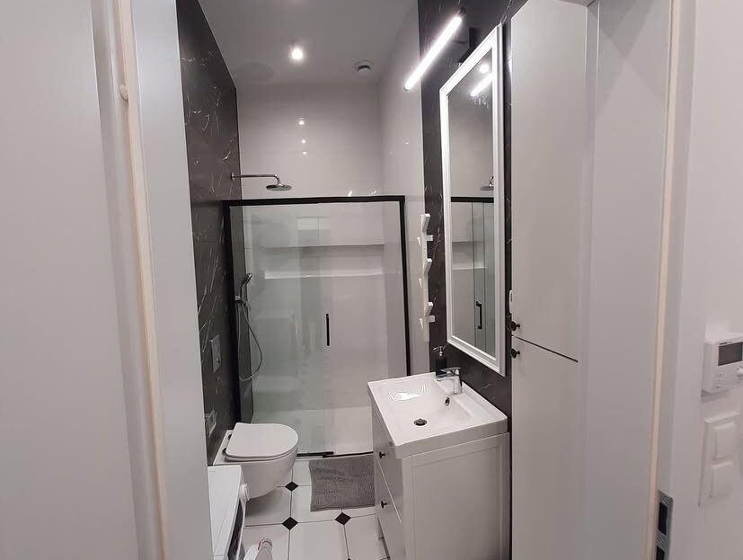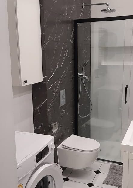 Kabina prysznicowa z drzwiami przesuwnymi,umywalka z szafką,toaleta,suszarka na ubrania,pralka SHARP,kosz na pranie,uchwyty na ręczniki, szafkami wiszące na kosmetyki,wysokie lustro,kinkiet oświetleniowy