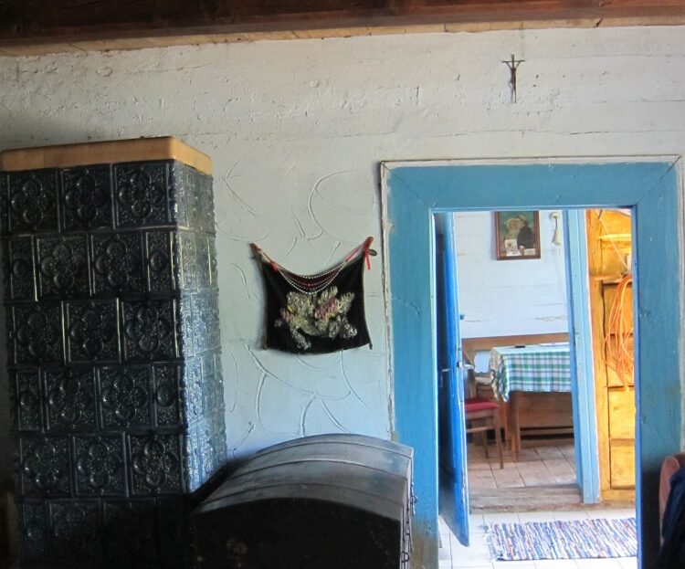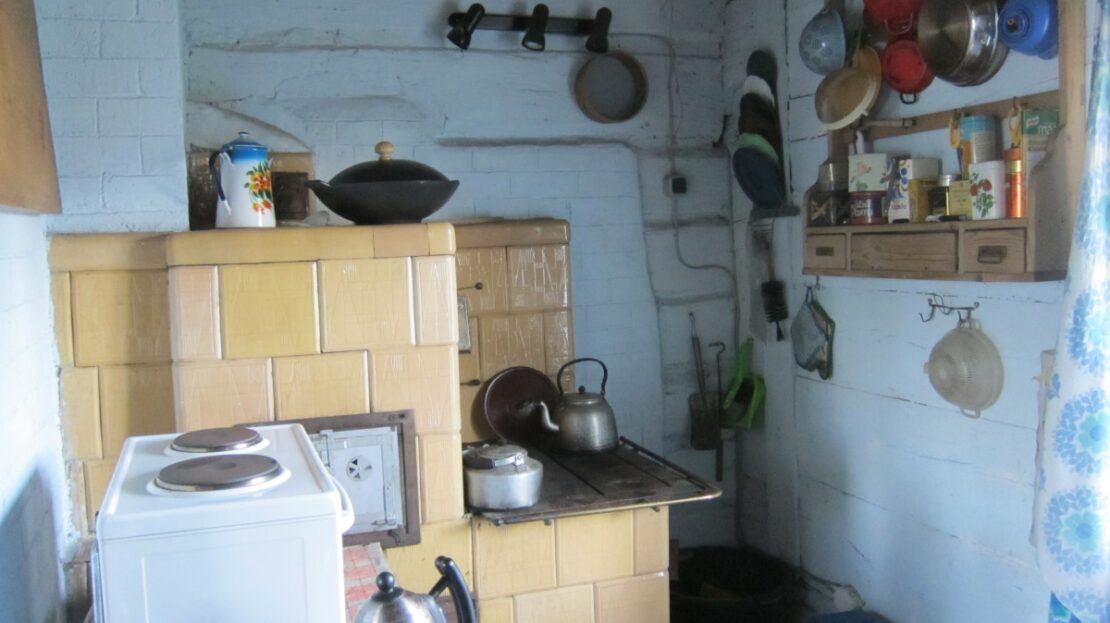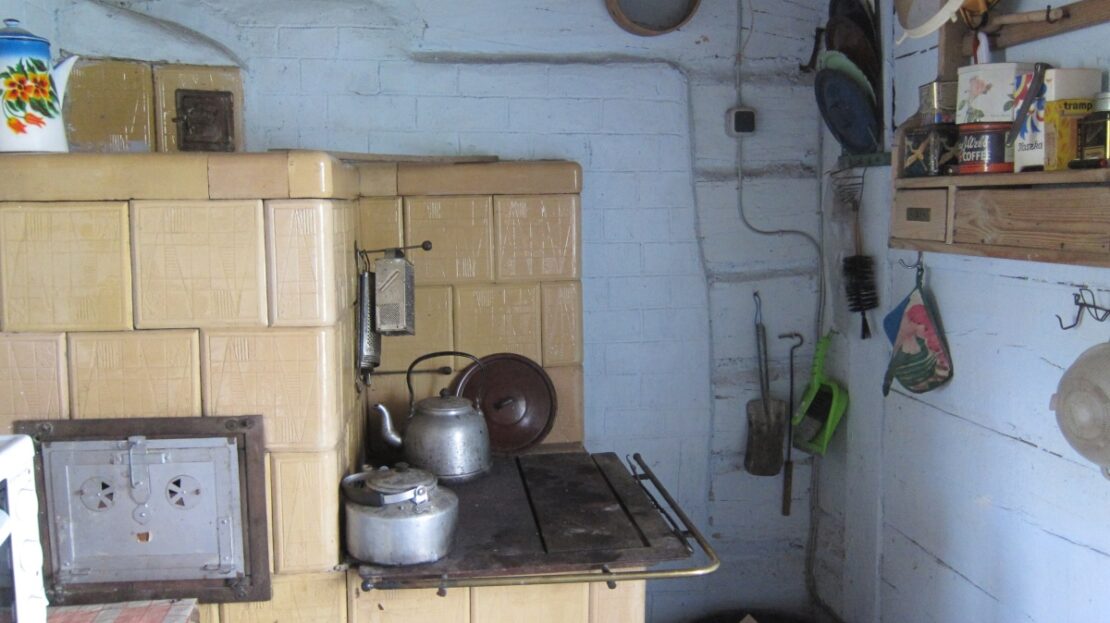 Piece kaflowe: w izbie niebieskie kafle z kamienicy z Krakowa, w kuchni piec kaflowy kuchenny z płytą, piekarnikiem i piecem chlebowym, wszystko sprawne.