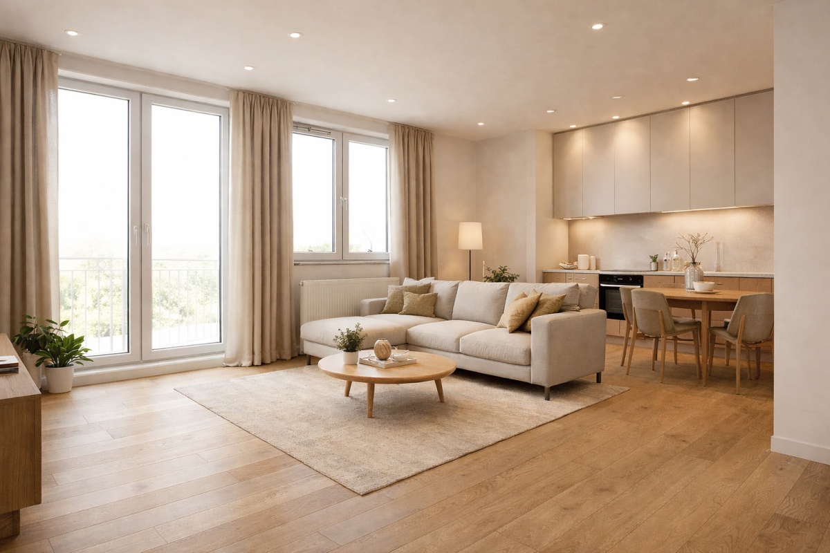 PIĘTRO (Pełna wysokość – Strefa Dzienna): Tu masz otwartą przestrzeń dla rodziny: salon z aneksem (27,5 m²), sypialnie i drugą łazienkę.