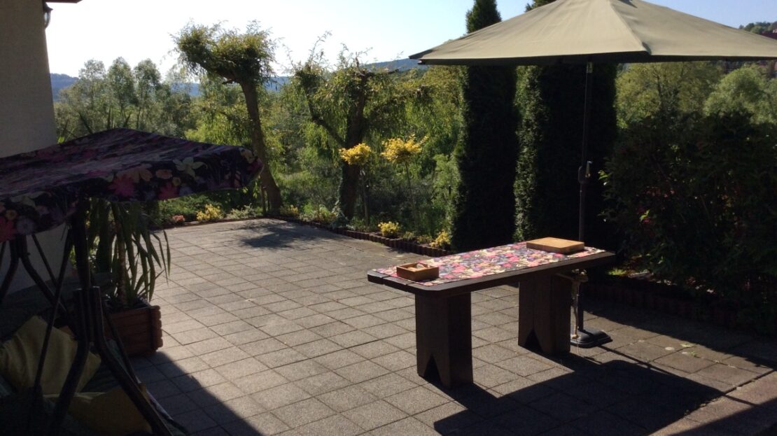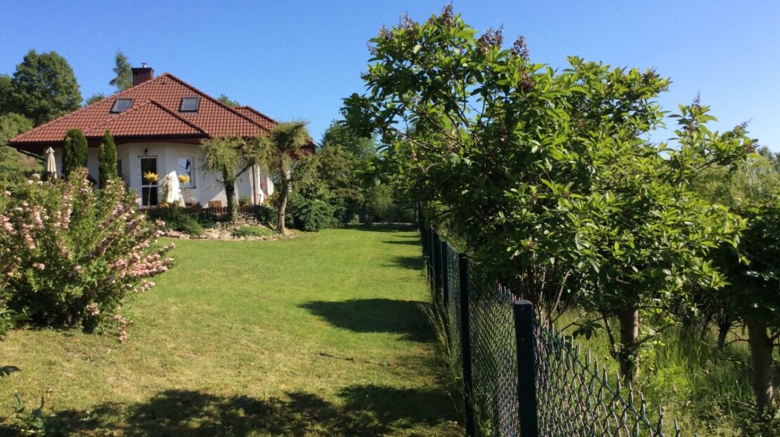 Ładnie utrzymany ogród, dużo kwiatów i roślin. Orzech, kilka rodzajów jabłoni, winorośl, śliwki.