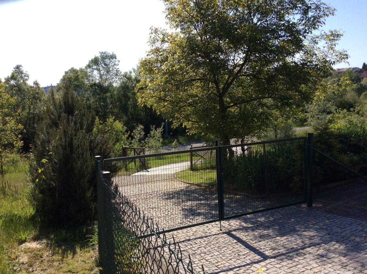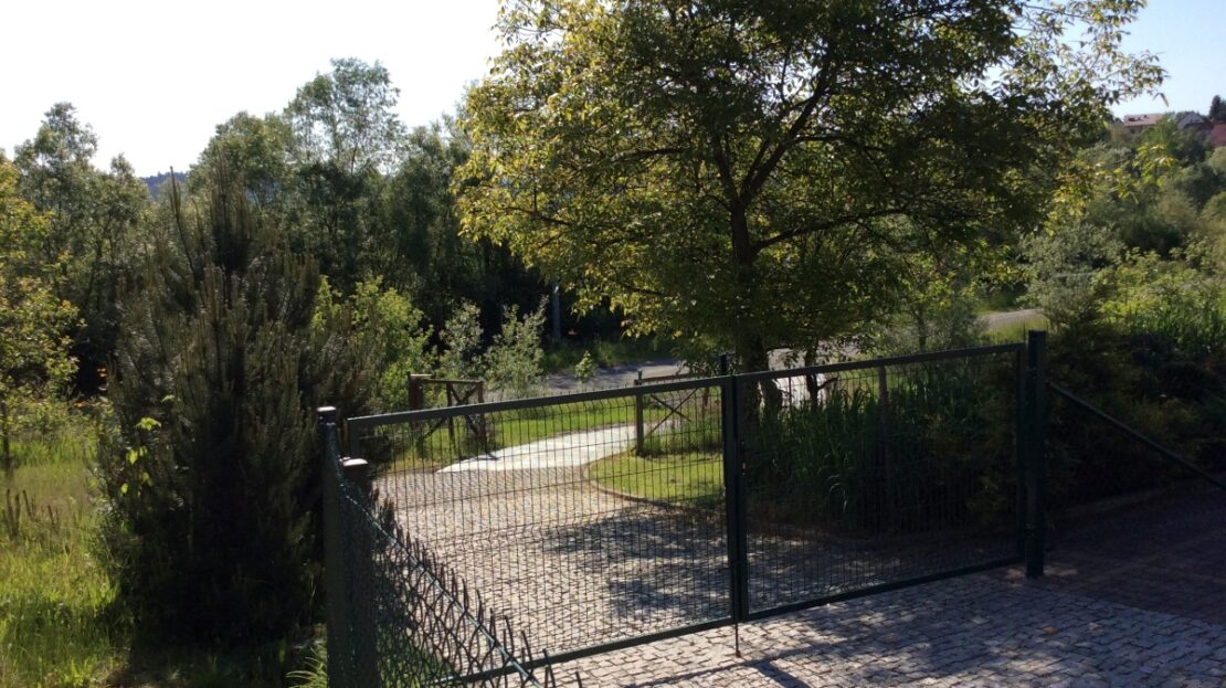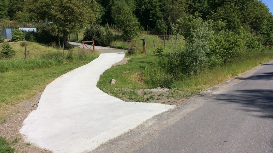 Dojazd ulicą asfaltową pod sam dom. Teren ogrodzony zieloną siatką z bramą i furtką na końcu ogrodu.
