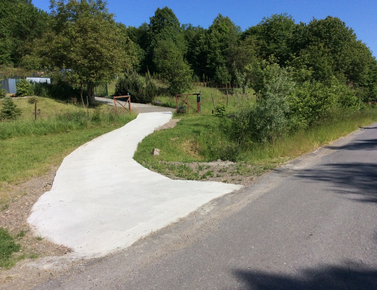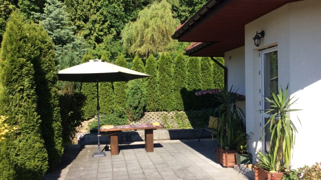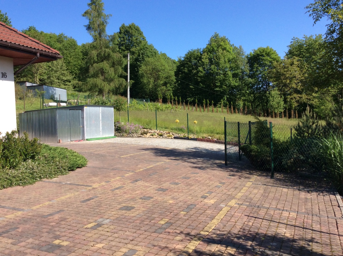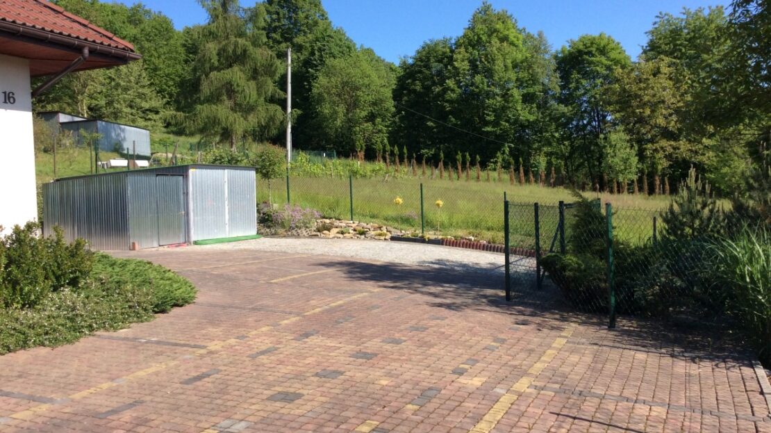 Duża zadaszona weranda od frontu, duży taras z wyjściem z salonu, całość domu otoczona kostką brukową i chodnikami, wybrukowany podjazd i teren do parkowania około 400 m2. Podjazd betonowy, a potem brukowany. Garaż blaszak 4×5 m, a obok blaszak na narzędzia 2×3 m.