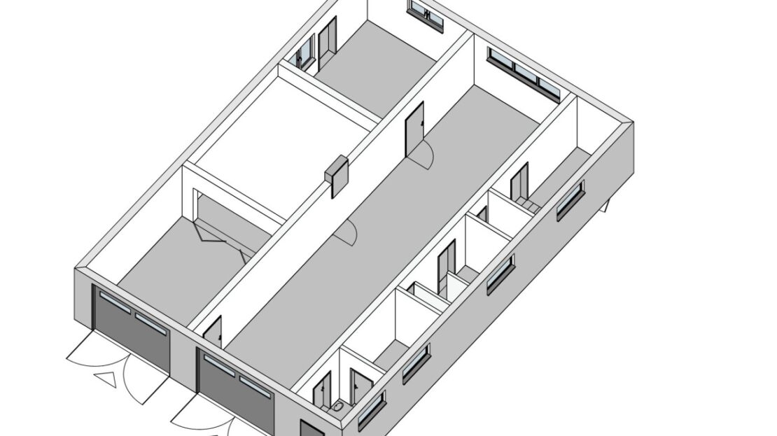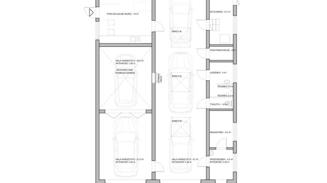 • 2 odrębne hale warsztatowe – max 5 samochodów osobowych, wysokość pom. 3,36 m, powierzchnia hal to 103 m²