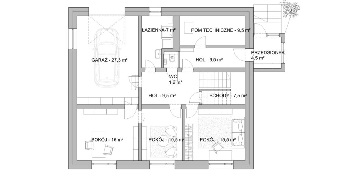 • Wbudowany garaż – 27,5 m2 z uchylną bramą na pilota, z oknem