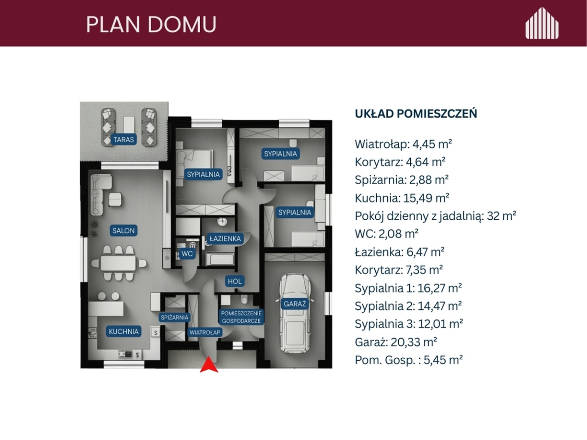 ✓ Przestronność i komfort: Dom o powierzchni 143,88 m², z funkcjonalnym układem pomieszczeń, zapewnia wygodę i przestronność.