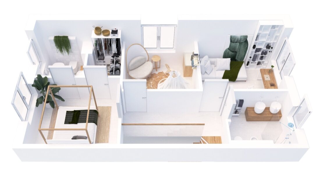 – łazienka + wc (5 i 2 m²), osobna garderoba