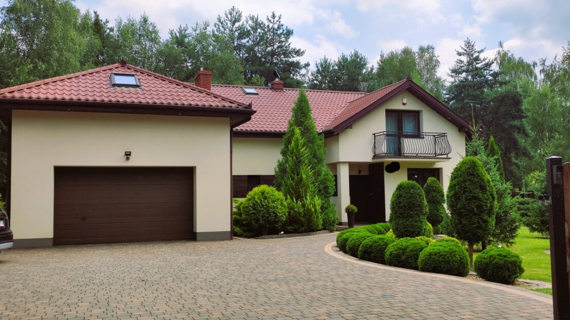 Technologia: Budowany z pustaków POROTHERM 42 cm, ocieplony, z wykończoną elewacją zewnętrzną i dachem z blachodachówki.